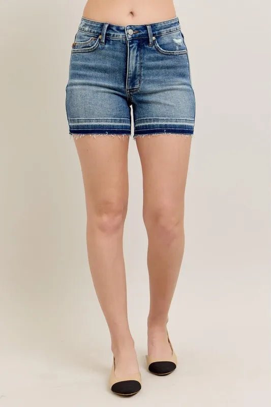 High Rise Raw Hem Denim Shorts – Medium Wash