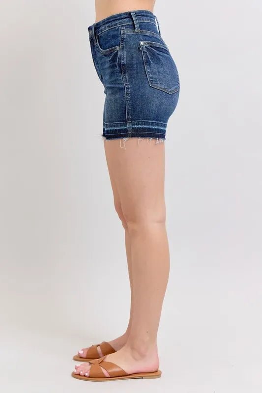 These High Rise Raw Hem Denim Shorts in Washed Indigo Blue bring playful vibes to your summer wardrobe. Crafted from a comfy cotton blend with a touch of stretch, they offer tummy control for a flattering fit. The raw hem adds a trendy edge, and plus sizes ensure everyone can rock this stylish look with confidence. Perfect for sunny days and casual adventures!