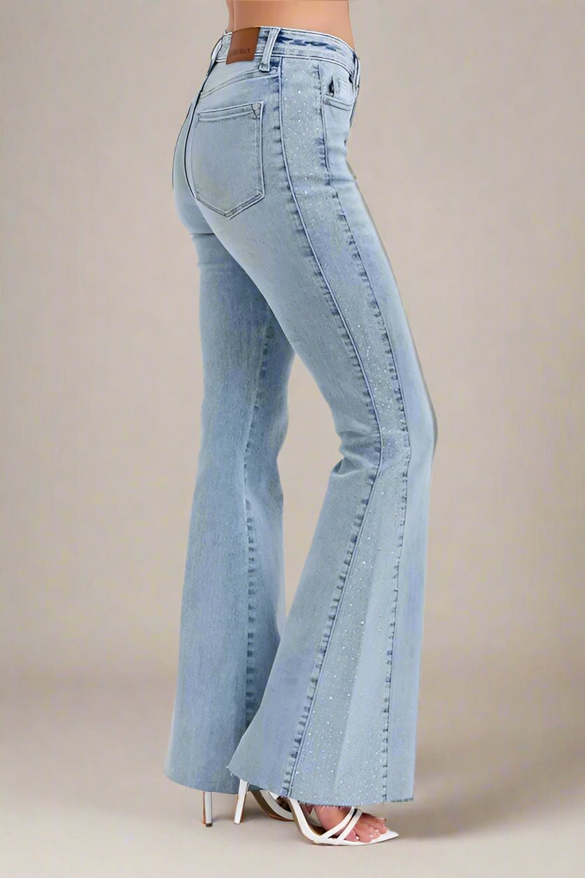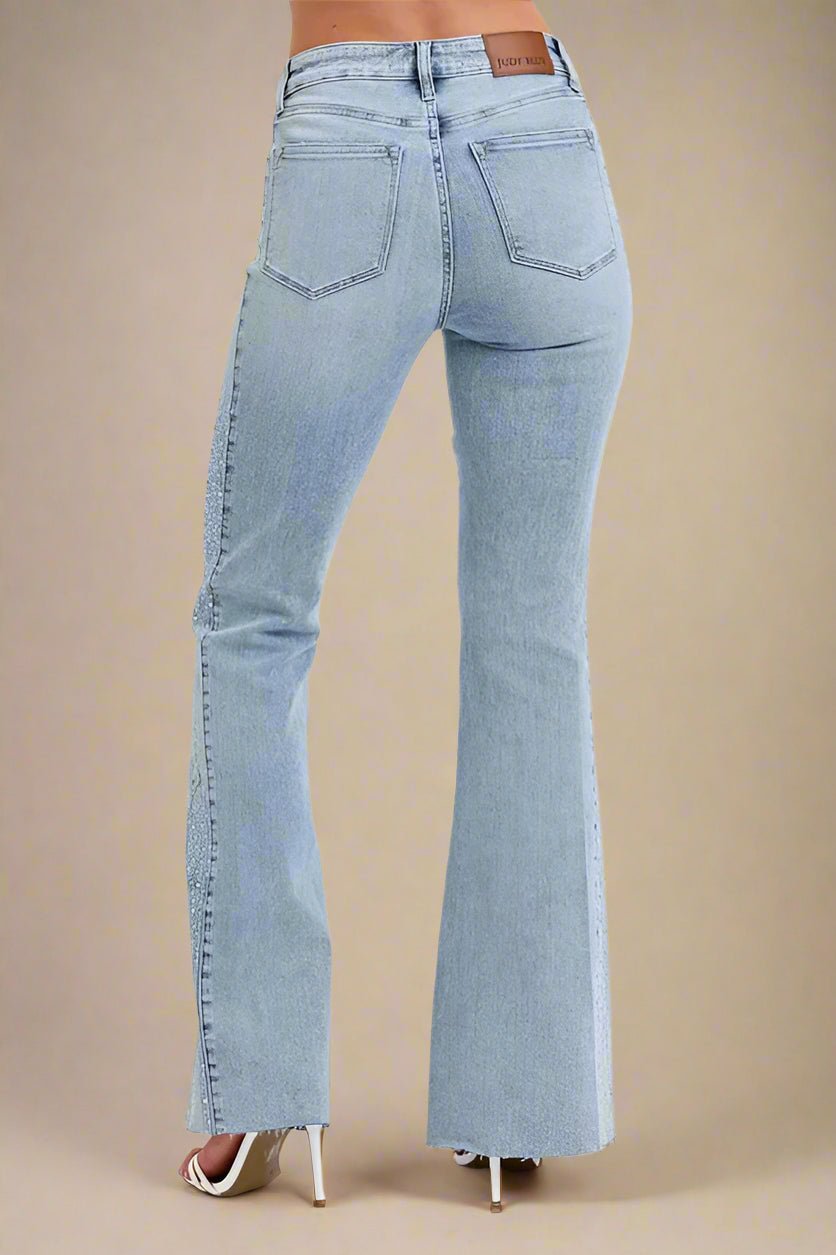 High Rise Rhinestone Flare Jeans in Light Wash Denim