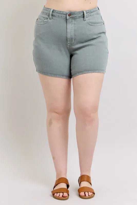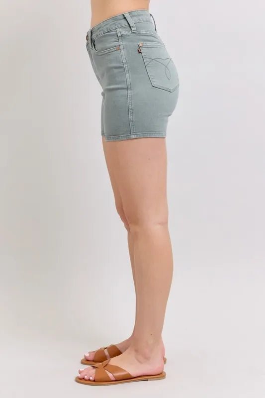 High Rise Stretch Denim Shorts – Sage Green Wash