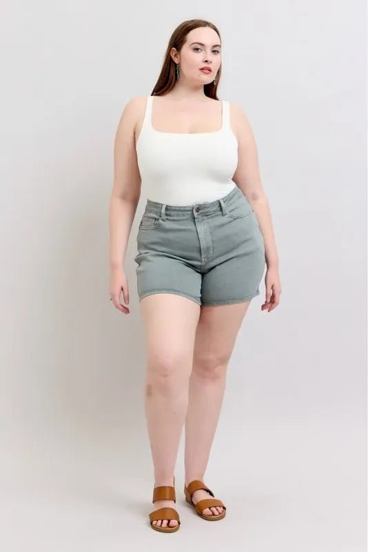 These High Rise Stretch Denim Shorts in a fresh Sage Green Wash combine comfort and style effortlessly. Crafted from a soft cotton blend with a touch of stretch, they move with you all day long. Designed to flatter every figure, plus sizes are available so everyone can enjoy this playful, versatile summer essential. Perfect for sunny days and casual adventures!