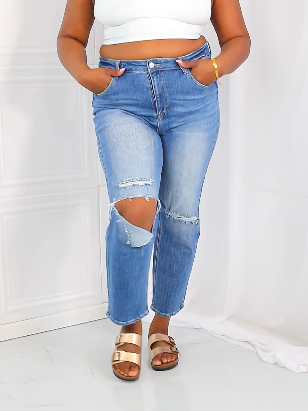 Soyez la reine du style non conventionnel avec ce jean taille haute raccourci et décontracté. Fabriqué à partir d'un mélange de coton pour plus de confort, ce jean de taille inclusive est parfait pour tous les types de corps. Libérez la fashionista qui sommeille en vous avec cette pièce unique et polyvalente !