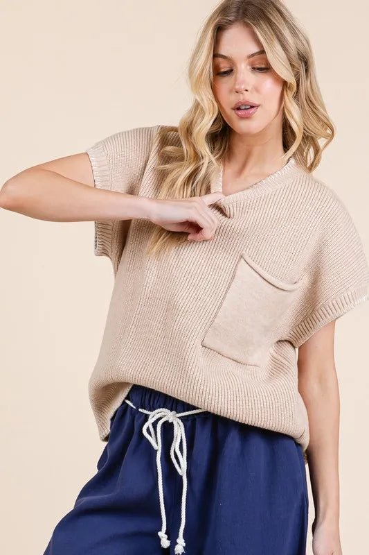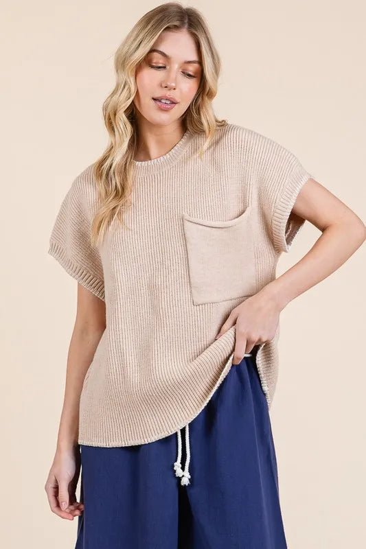 Cozy meets chic in this Short Sleeve Rib Knit Sweater in Cream Sandstone. Its soft ribbed texture hugs you just right, while the creamy sandstone shade adds a warm, sunny vibe to any outfit. Perfect for layering or wearing solo, it’s your new go-to for effortless style with a playful twist.