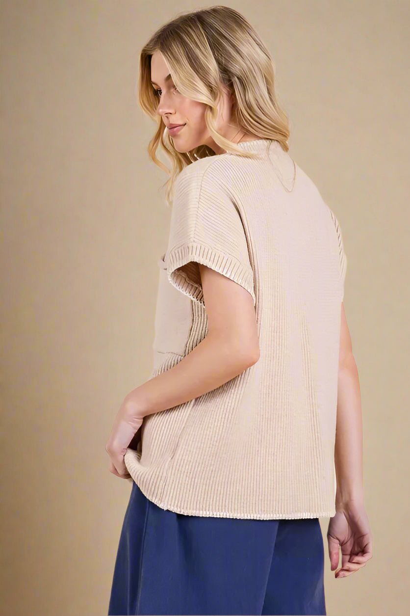 Short Sleeve Rib Knit Sweater in Cream Sandstone