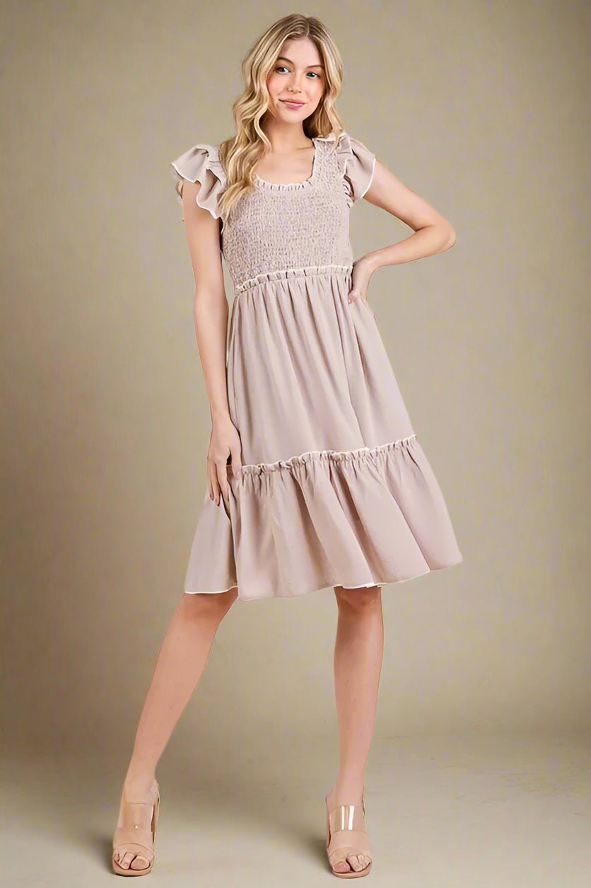 This Smocked Flutter Sleeve Tiered Mini Dress in Taupe Stripe features playful flutter sleeves and a flattering tiered design. Lined for comfort and equipped with handy pockets, it’s perfect for twirling through sunny days with ease and style.