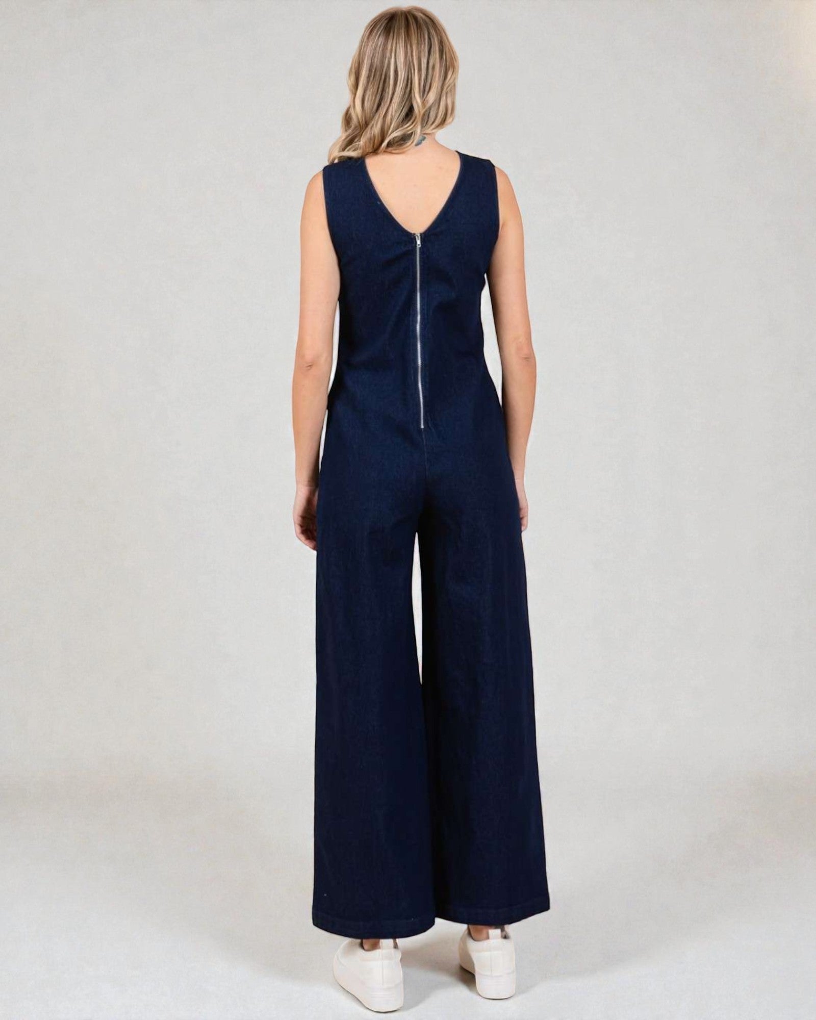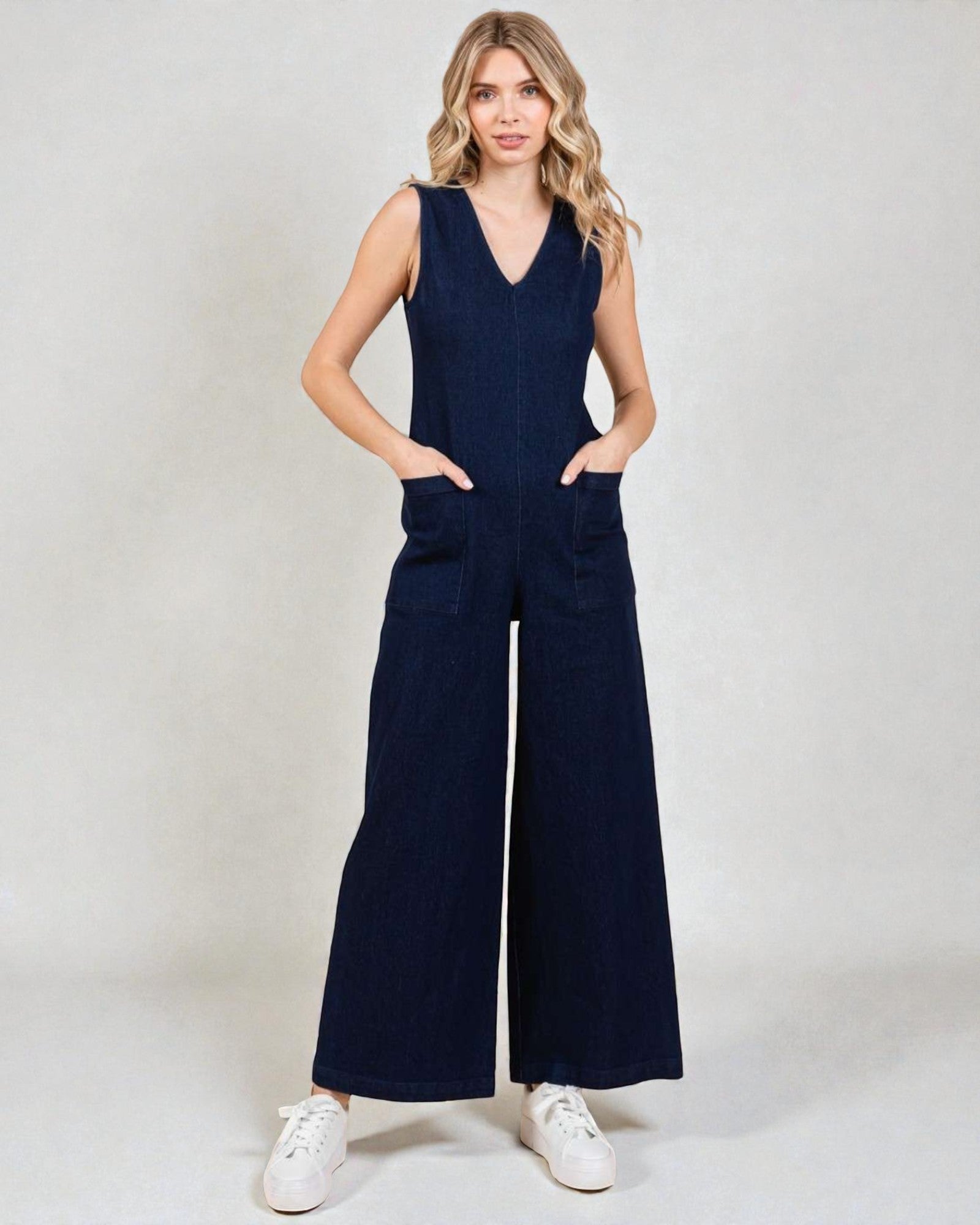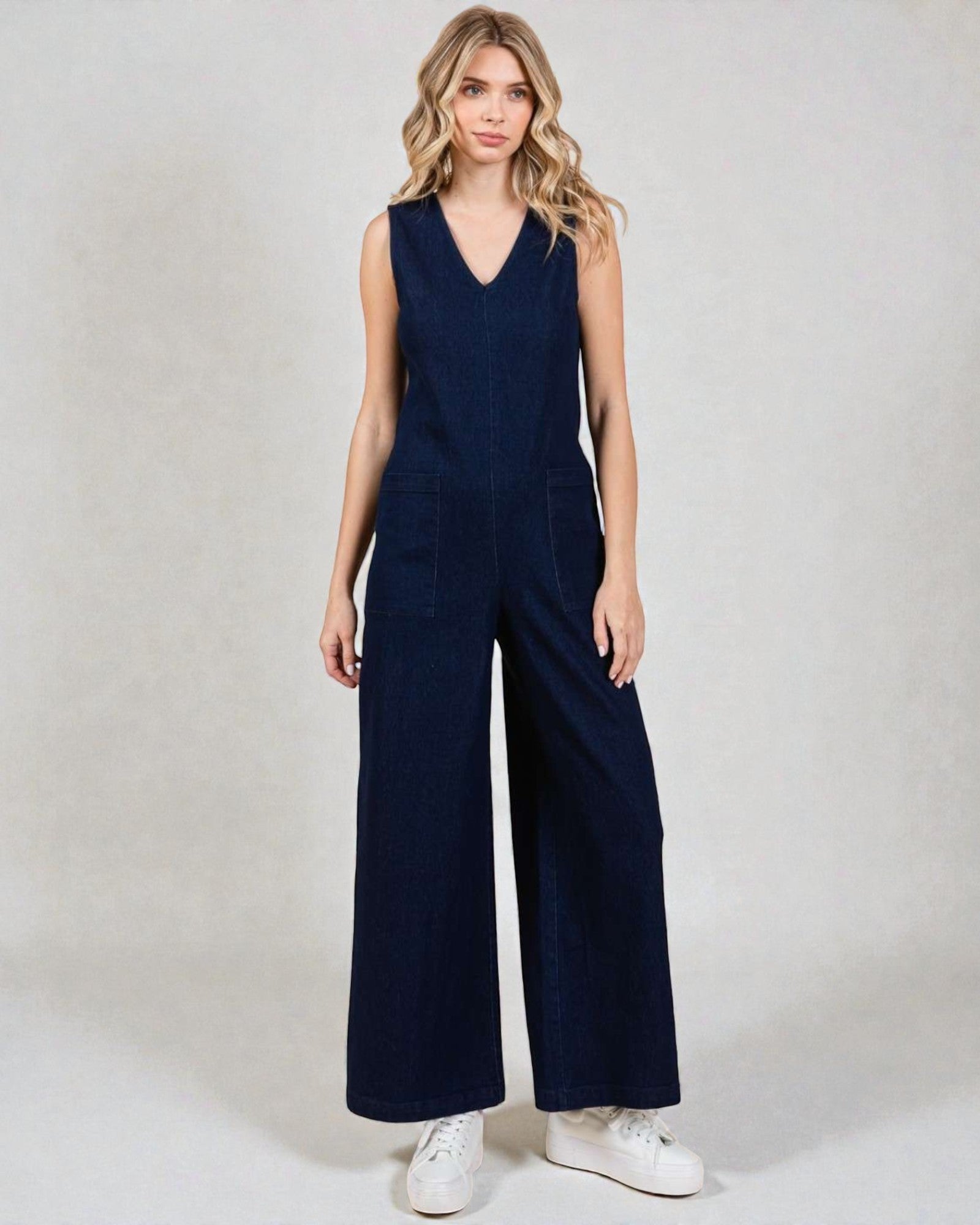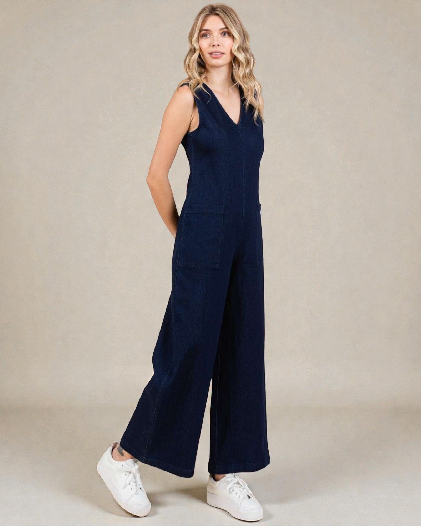 Restez cool et chic dans cette combinaison en denim foncé sans manches à jambe large. Avec des poches pour plus de commodité et un tissu en mélange de coton confortable, vous serez à l'aise en toute occasion. Élégante et pratique sans effort - pas besoin de faire de compromis !