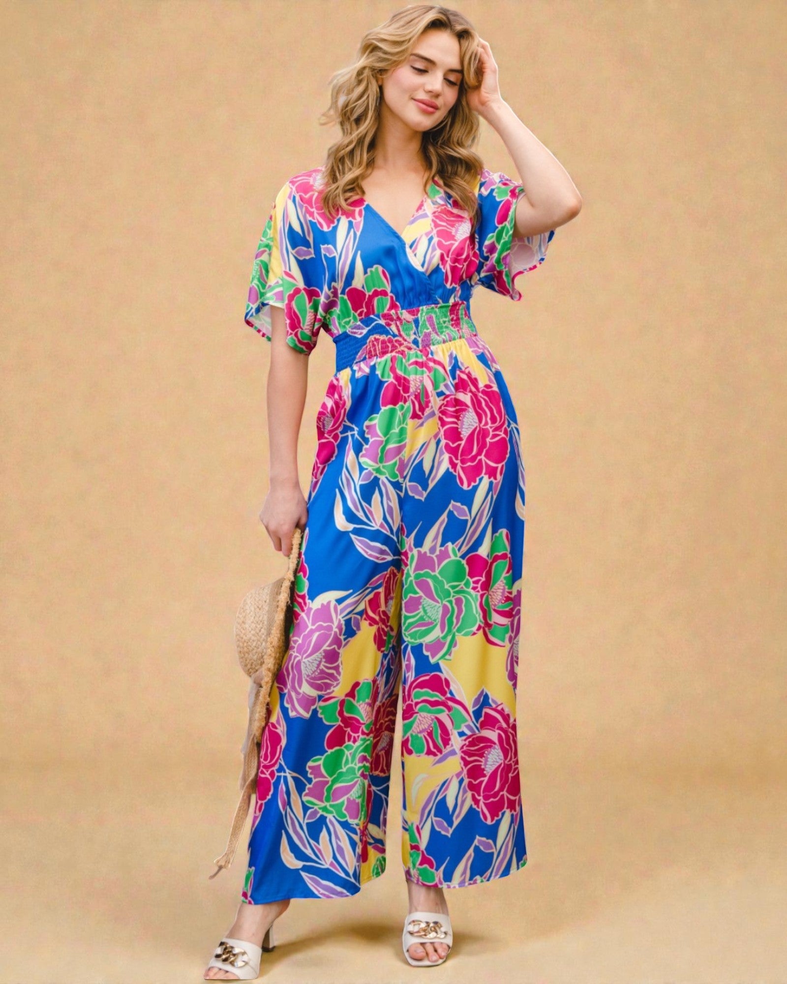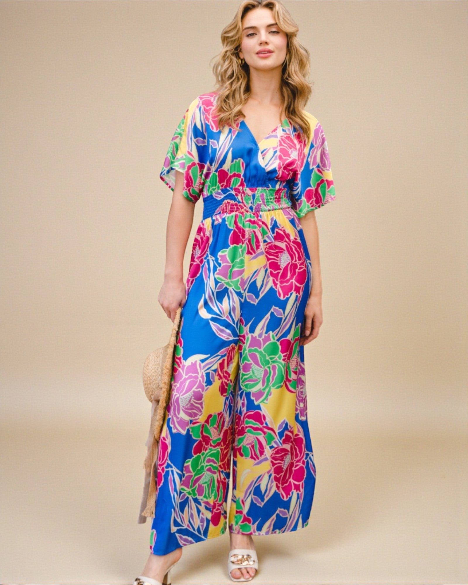 Libérez votre pouvoir floral intérieur avec cette combinaison à imprimé floral. Le dos ouvert et le col en V ajoutent une touche d'audace, tandis que les manches courtes et les jambes larges la maintiennent au frais et confortable. Parfaite pour toutes les tailles, cette combinaison est prête à affronter toutes les aventures (ou siestes) qui se présentent à vous !