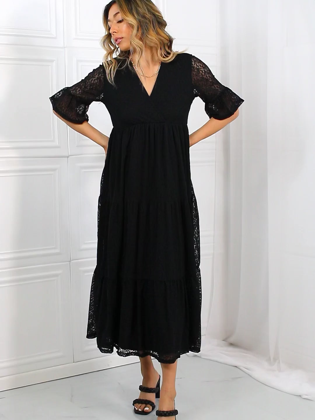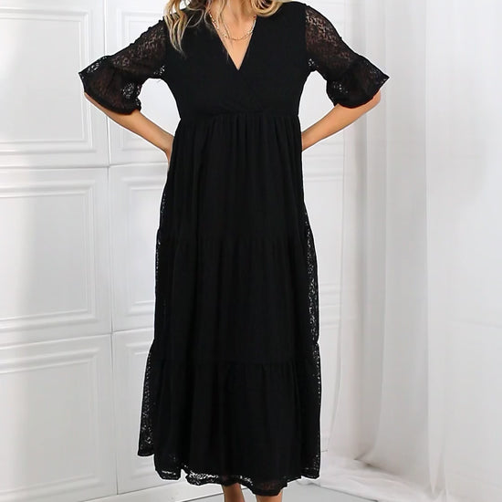 Préparez-vous à faire tourner les têtes avec cette robe mi-longue taille empire en dentelle ludique. Les manches à demi-volants et le col en V ajoutent une touche de fantaisie à cette robe classique. Avec un intérieur doublé et une taille inclusive, cette robe est à la fois confortable et polyvalente. Parfaite pour toutes les occasions !