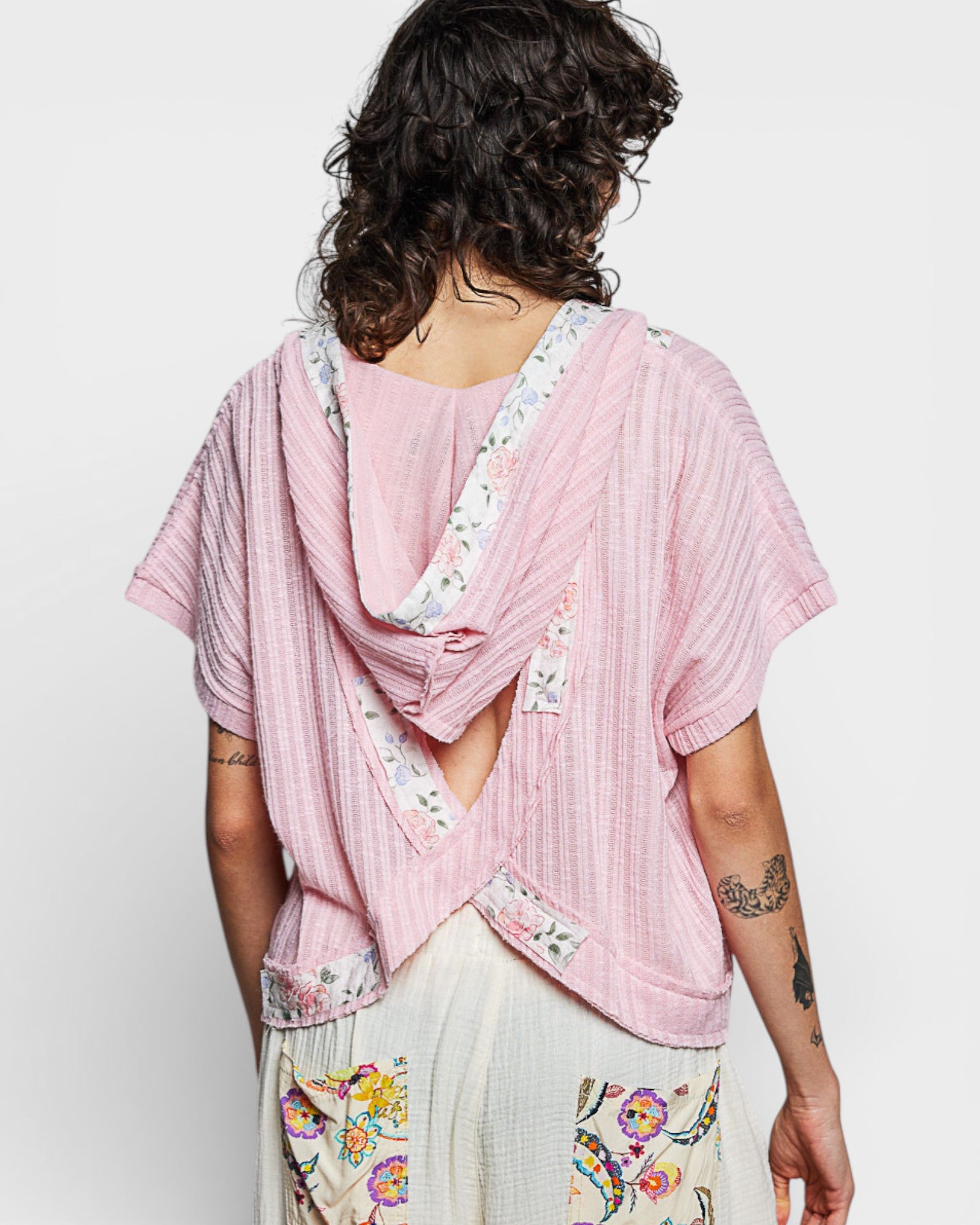 Unexpected and effortlessly cool—this pink ribbed top pairs soft floral trim with a relaxed silhouette and a dramatic open crisscross back. Finished with a hood for that laid-back, boho edge you don’t see coming.