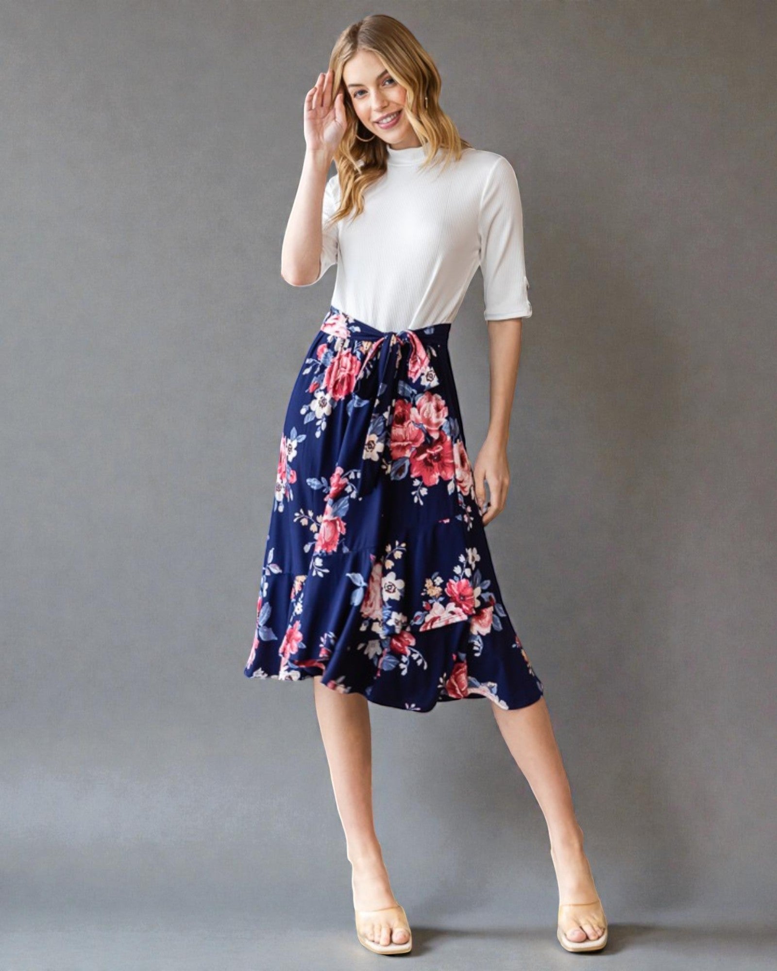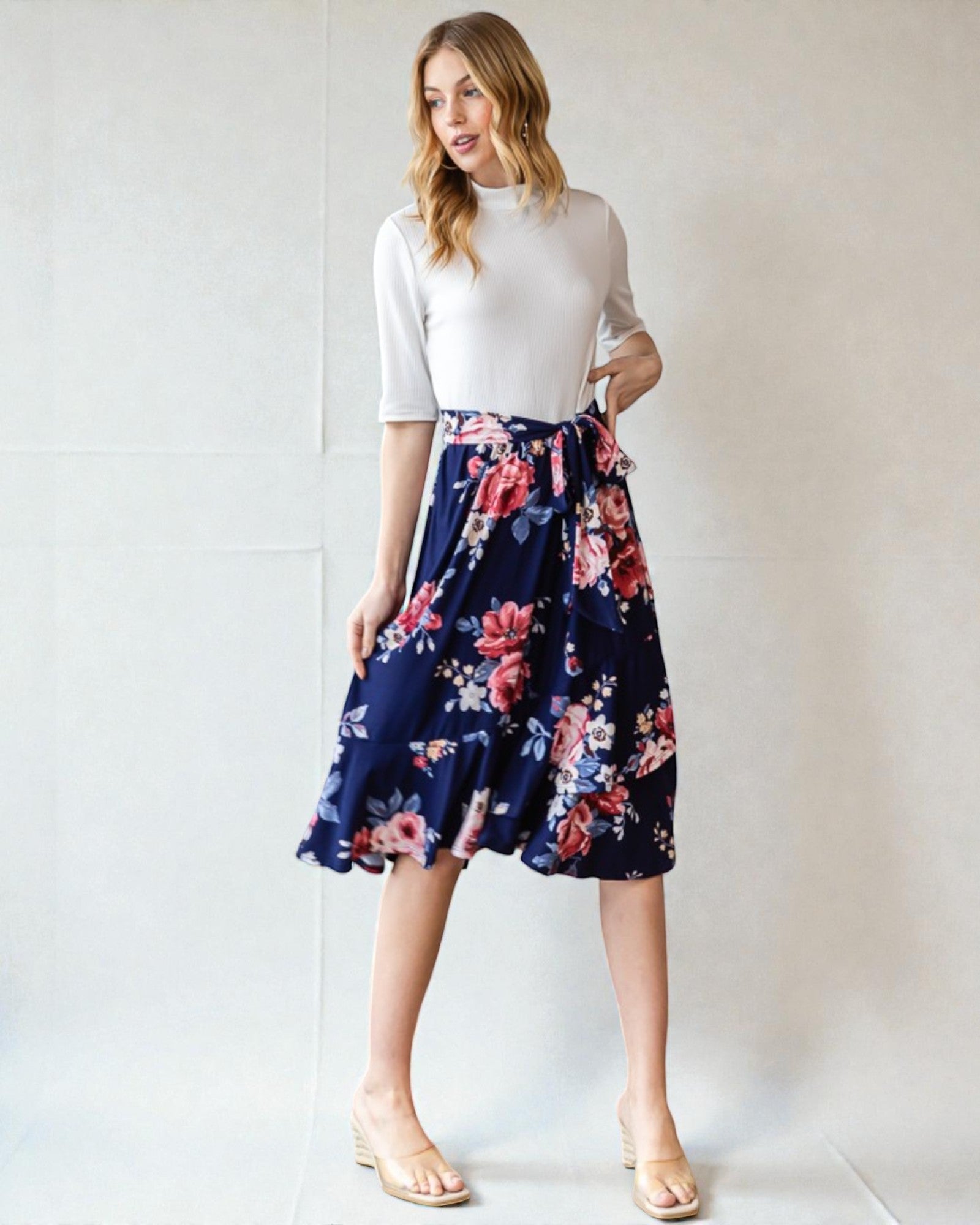 Affichez votre côté amusant et séduisant avec notre jupe mi-longue à volants et ourlet portefeuille fleuri en bleu marine ! Cette jupe fluide présente un ourlet à volants ludique et un design portefeuille tendance. Parfait pour ajouter une touche de fantaisie à n'importe quelle tenue. Pas de fleurs fanées ici ! 🌺🌼🌺