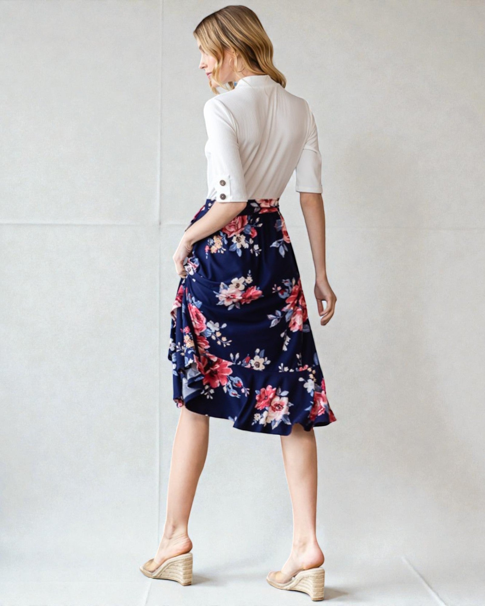 Jupe mi-longue portefeuille fleurie à ourlet volanté en bleu marine