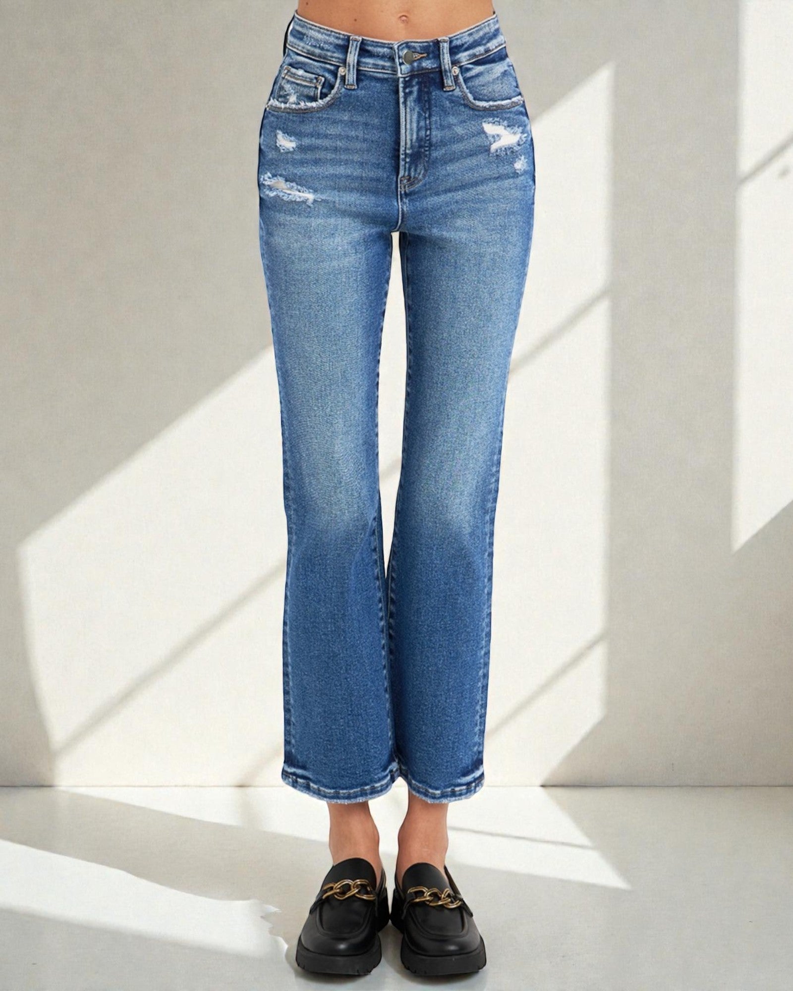 Découvrez notre jean bootcut taille haute à délavage foncé et effet gainant ! Ce jean en mélange de coton offre une légère élasticité pour un confort tout au long de la journée, tout en offrant un design flatteur et gainant le ventre. Disponible en grandes tailles pour un ajustement parfait. Restez élégante et confortable dans toutes les tailles avec notre dernier ajout !