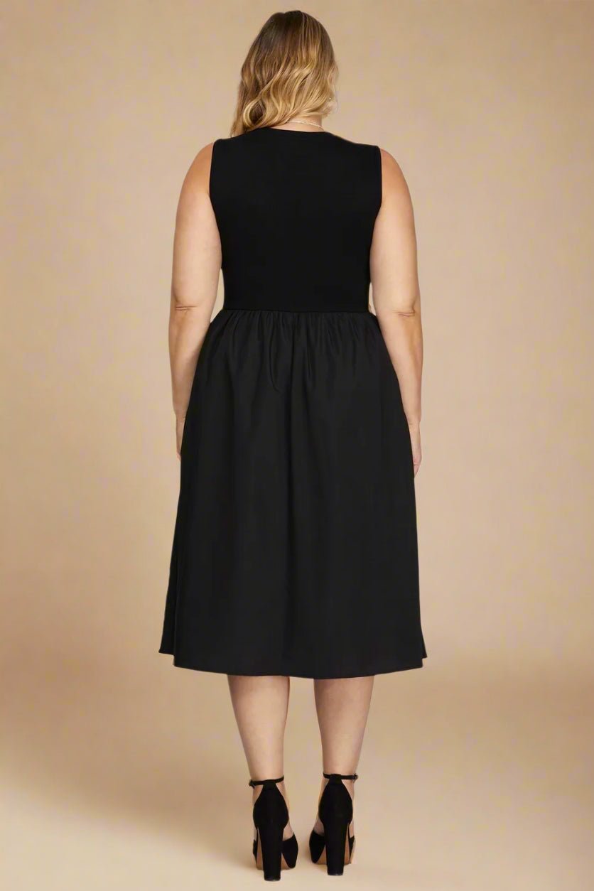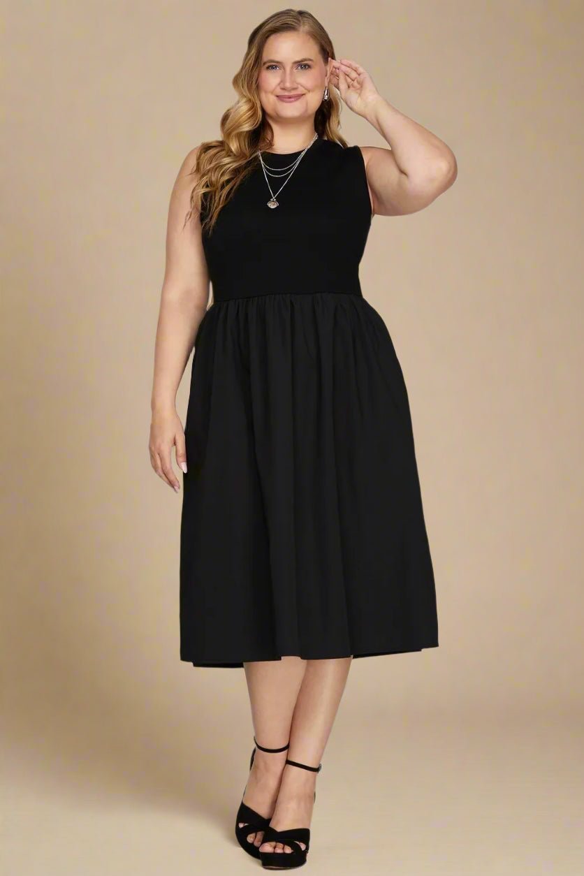Add some flair to your wardrobe with our Black Sleeveless Fit and Flare Midi Dress! Constructed with a comfortable cotton blend and light stretch, this dress is perfect for any occasion. Complete with a lined bodice and convenient pockets. Available in plus sizes.