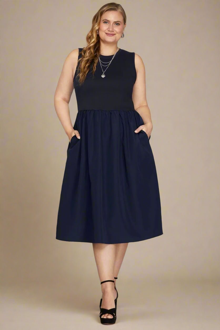 Flaunt your style with our Sleeveless Fit & Flare Midi Dress in Midnight Navy! Made from a comfortable cotton blend with light stretch, this lined dress offers both style and convenience with its pockets. Available in plus sizes, it's perfect for any occasion. Get ready to turn heads!