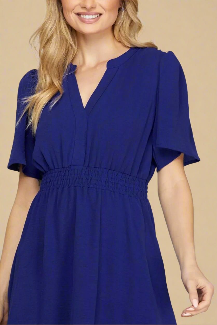 Flirt with fashion in the Smocked Waist Tiered Mini Dress! This cobalt blue dress features delightful flutter sleeves that add playful movement to your look. With a smocked waist that accentuates your figure, this dress is both stylish and comfortable. Perfect for any occasion, this dress is sure to make a statement!