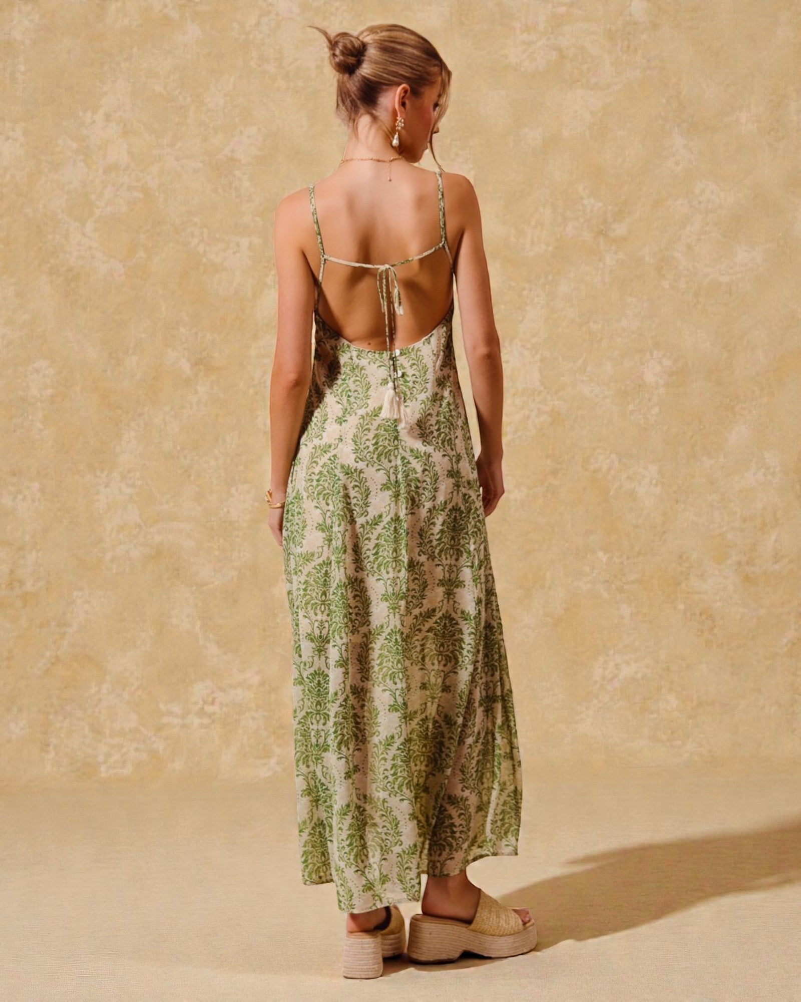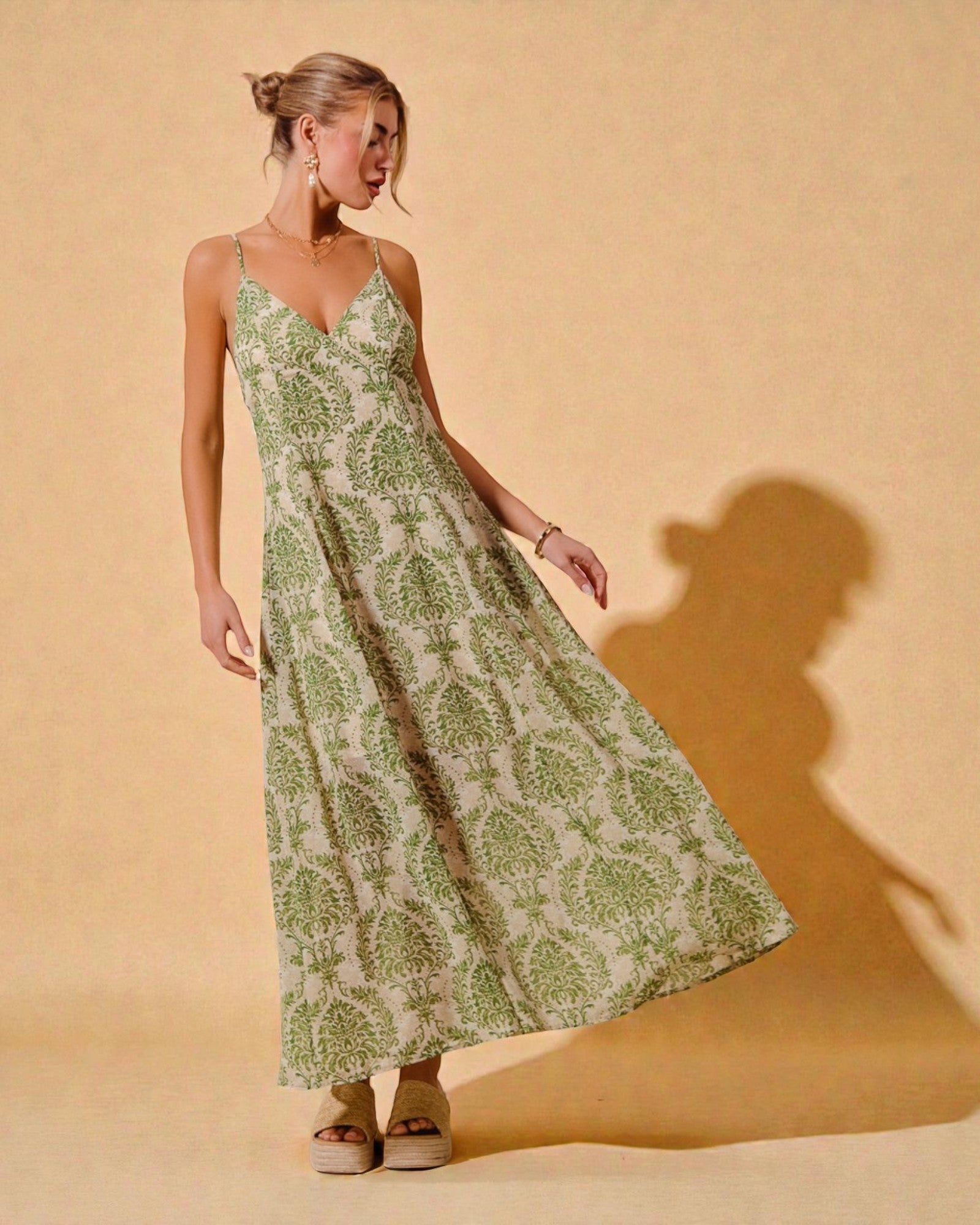 Slip into effortless elegance with this damask maxi dress that's equal parts sophisticated and fun. The lined silhouette drapes beautifully in olive and ivory tones, while spaghetti straps and a flattering V-neckline keep things breezy. Practical pockets let you stash your essentials, and the unexpected open back adds just the right amount of flirtation.