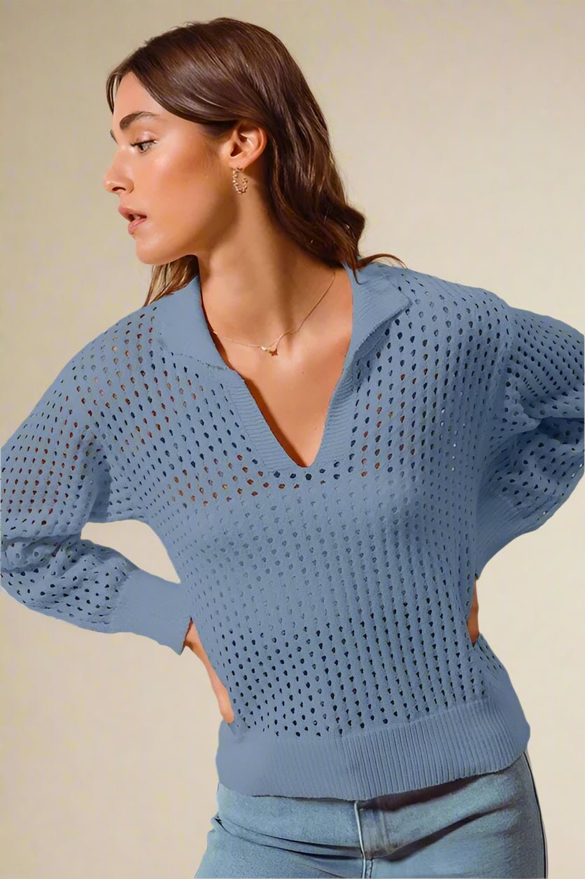 Open Knit Collared Sweater in Soft Denim Blue