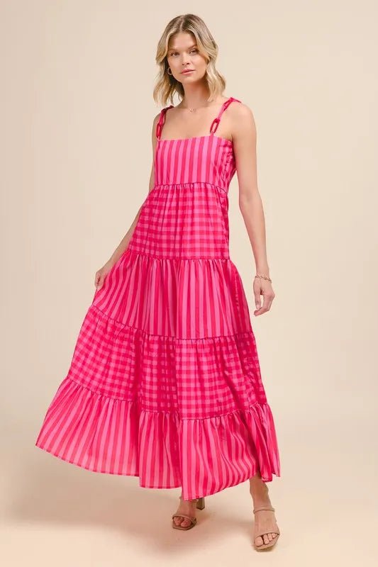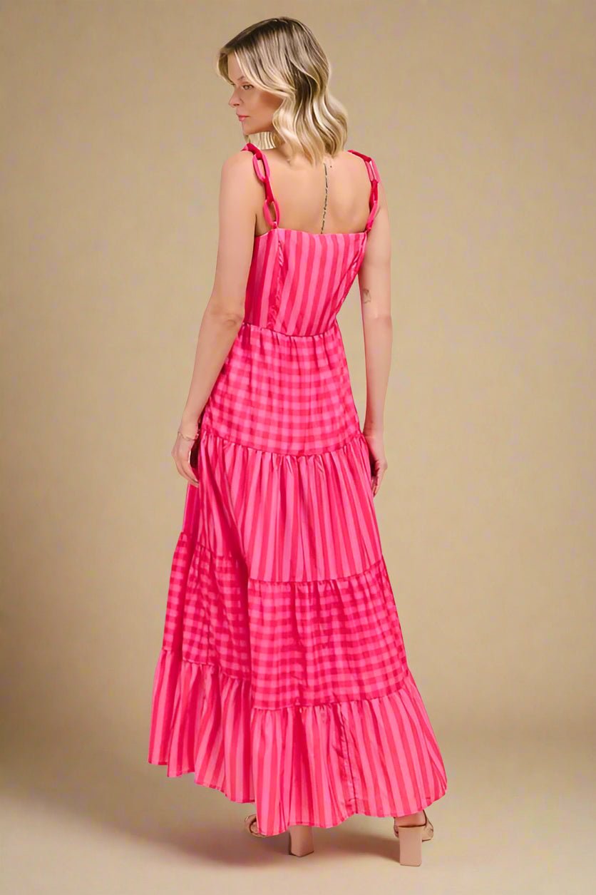 Brighten your wardrobe with this playful Fuchsia Stripe Tiered Maxi Dress. Featuring sleeveless styling and chic chain link straps, it delivers a fun mix of elegance and edge. The tiered silhouette creates a breezy, flirty flow perfect for any sunny outing or lively gathering.