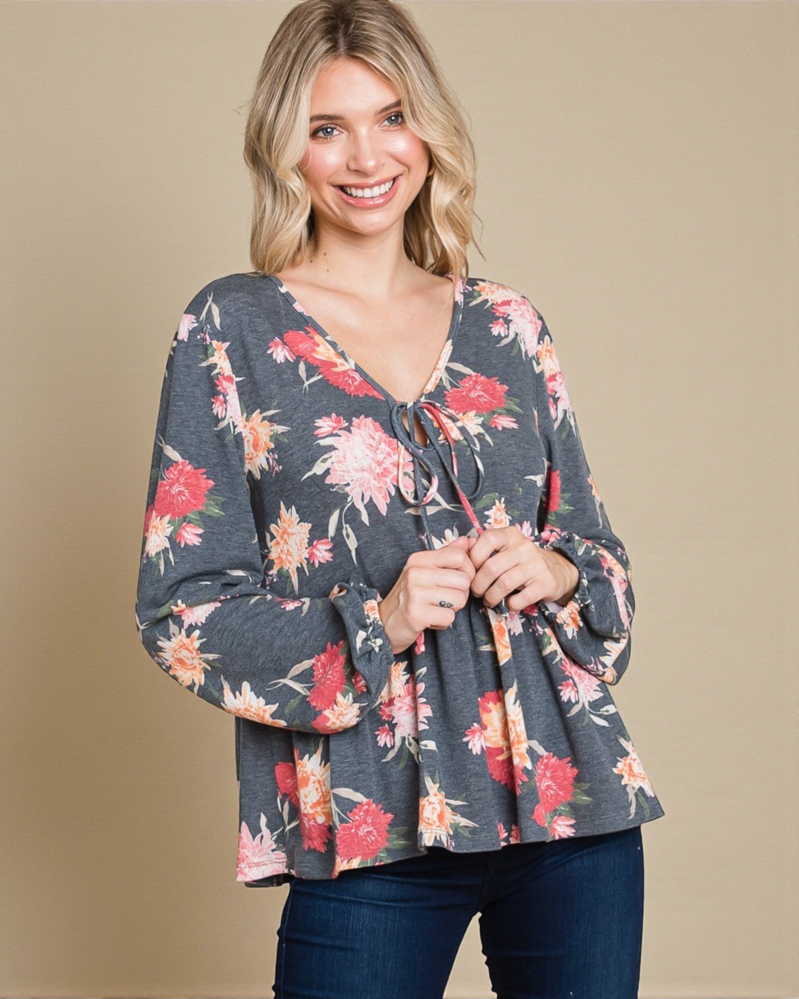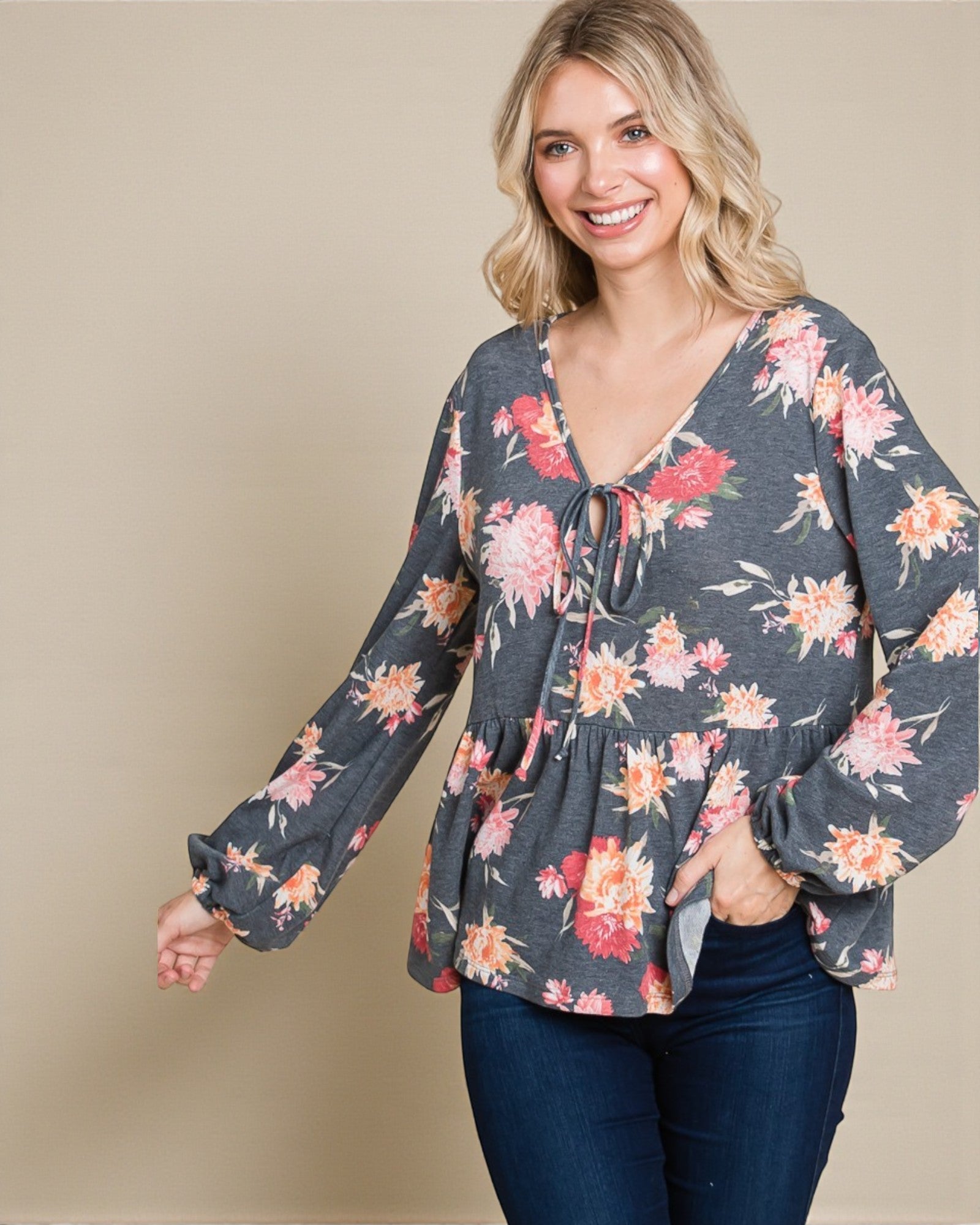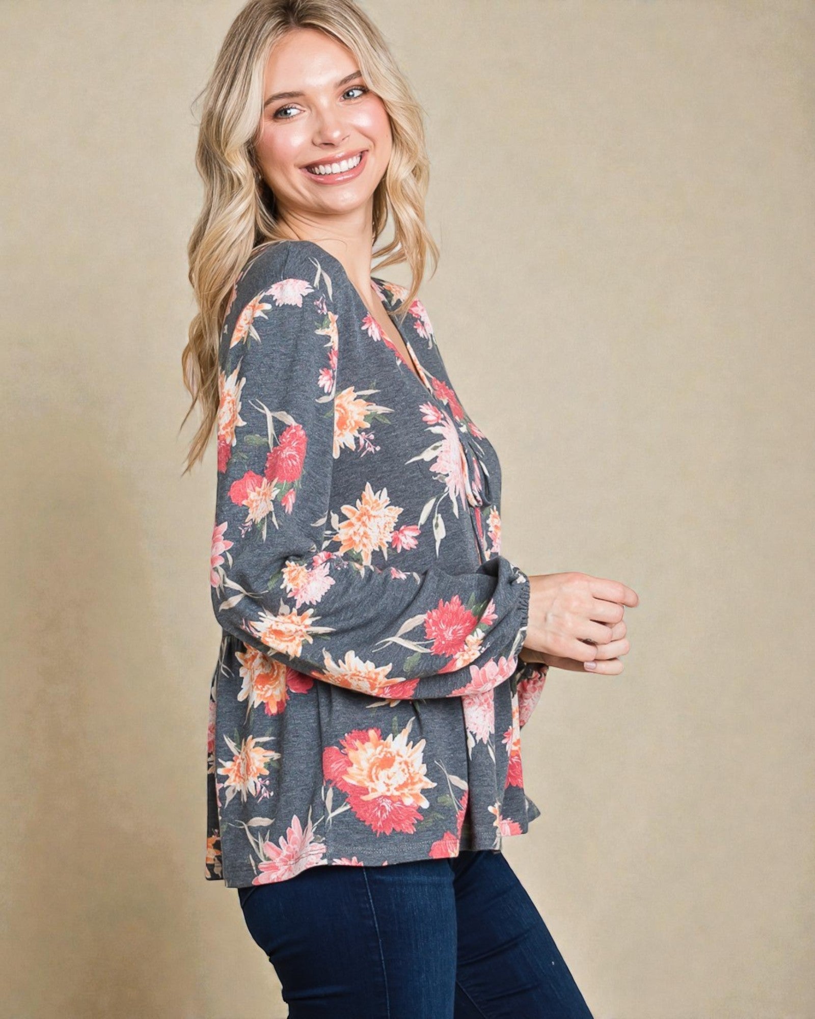 Chemisier à manches longues et basque fleuri en anthracite