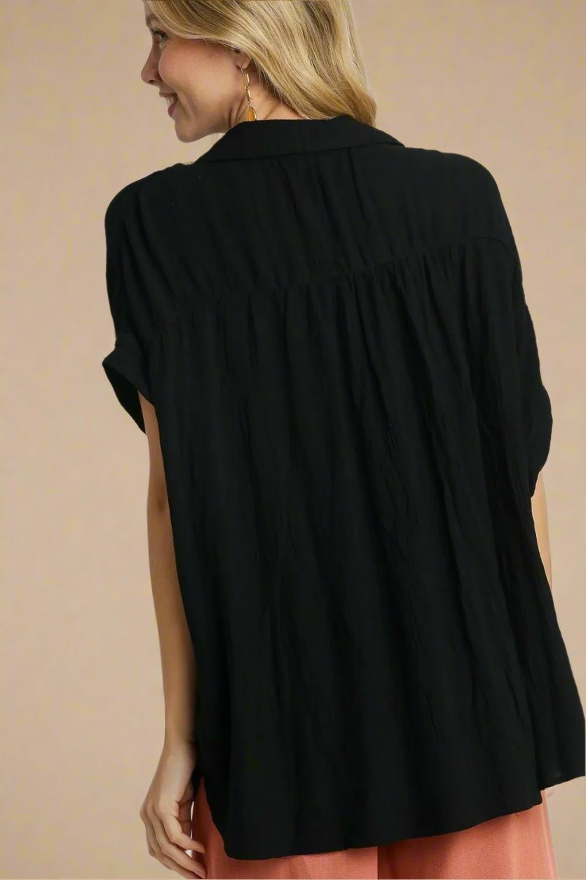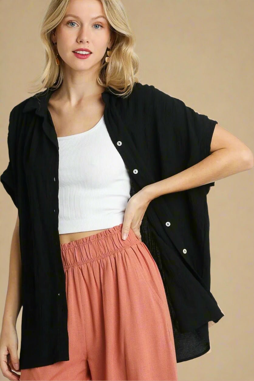 Black Gauze Button-Up Short Sleeve Shirt