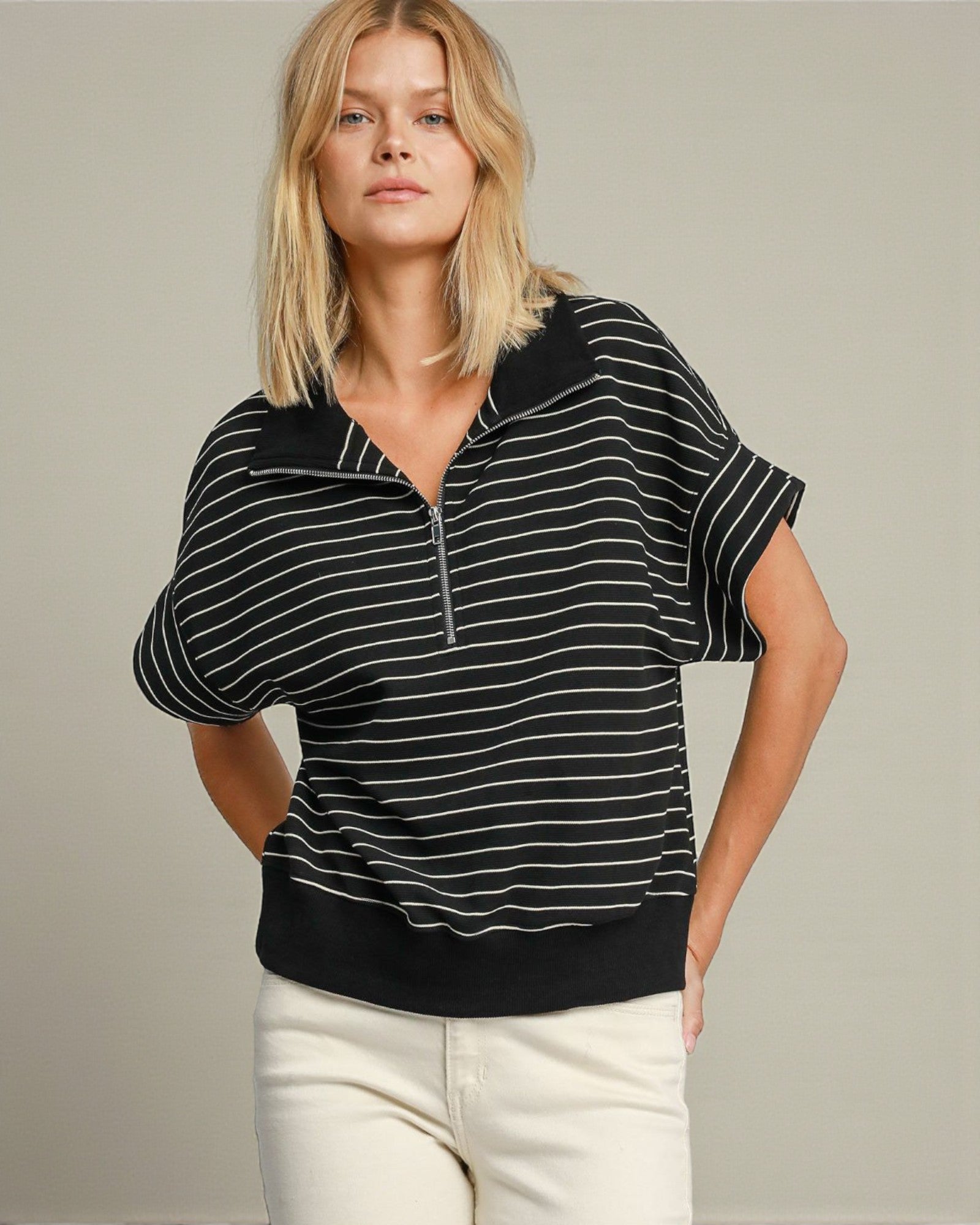Effortless stripes meet everyday comfort in this black and ivory half-zip pullover. Crafted from a breathable cotton blend, it's the perfect layer for casual outings or relaxed weekends. The short sleeves keep things cool, while the half-zip design lets you adjust your vibe on the fly. Pair it with your favorite jeans or shorts for a look that's put-together without trying too hard.