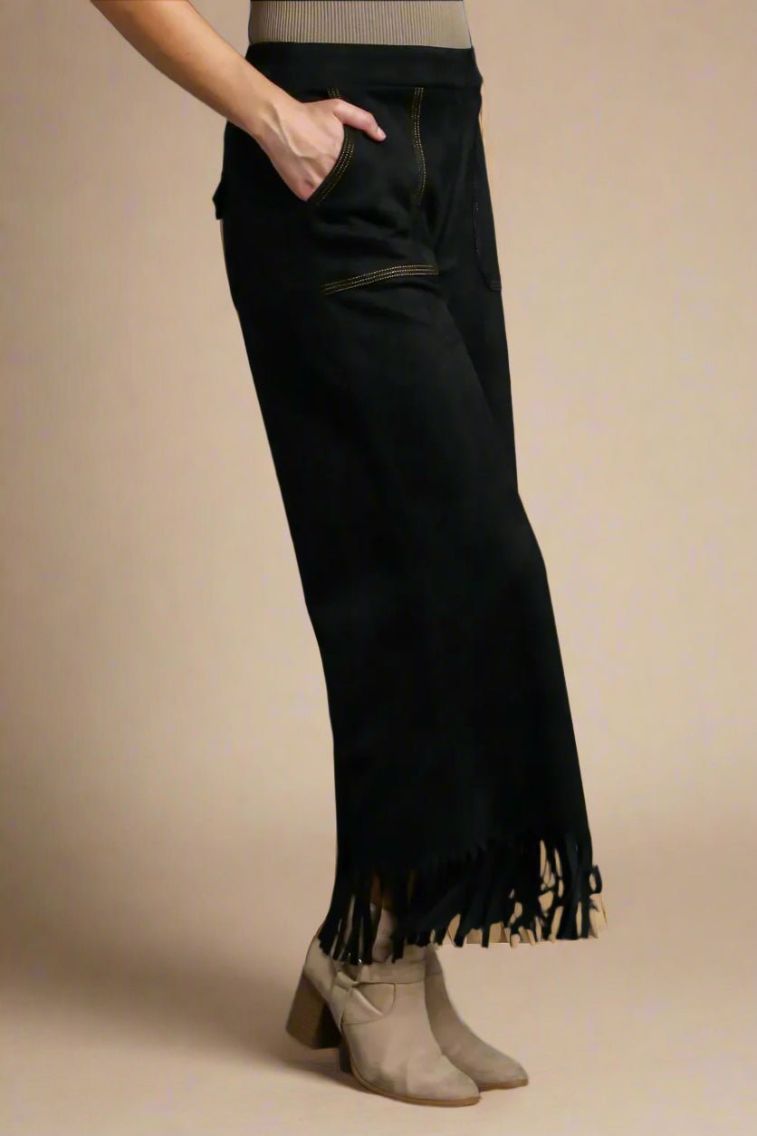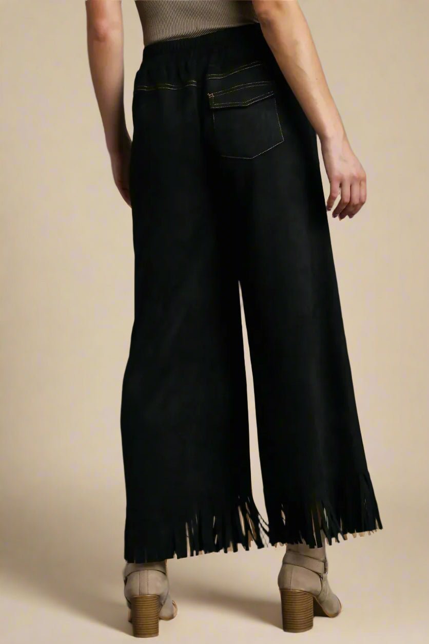 Black Vegan Suede Wide Leg Pants Fringe Hem