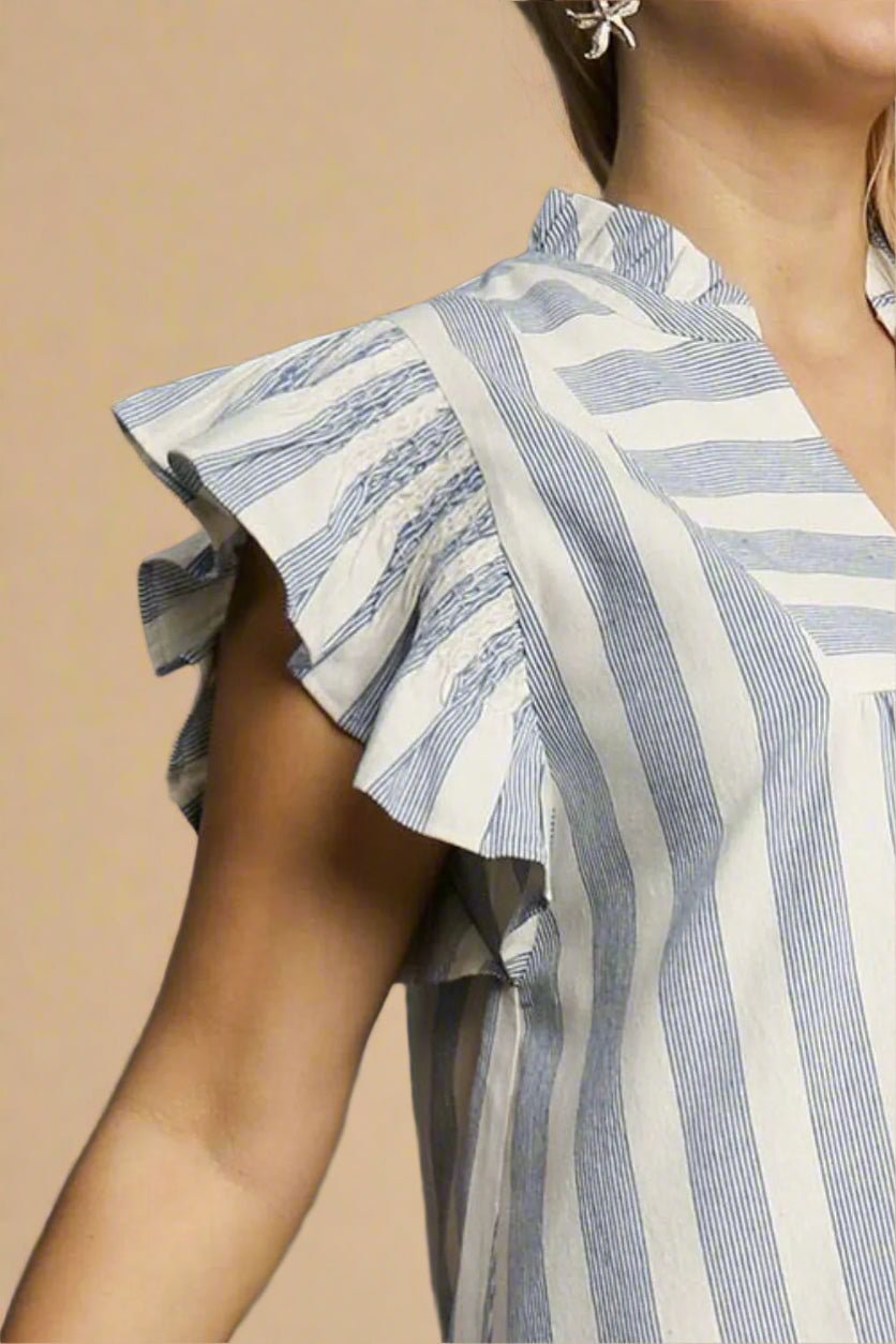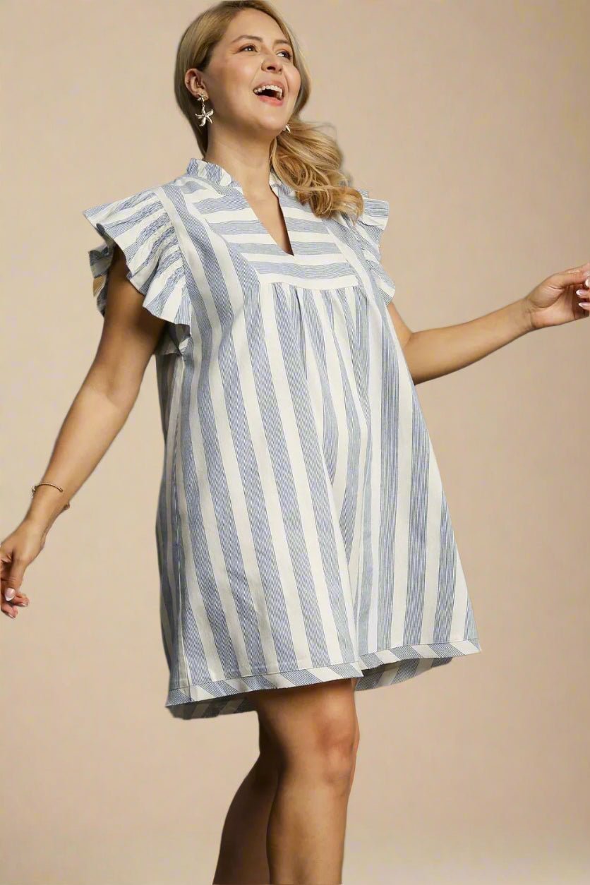 Dress up in our flirty Blue Stripe Babydoll Mini Dress with Ruffle Sleeves. Stay comfortable and stylish with the option for plus sizes! Perfect for a casual day out or a fun night on the town!