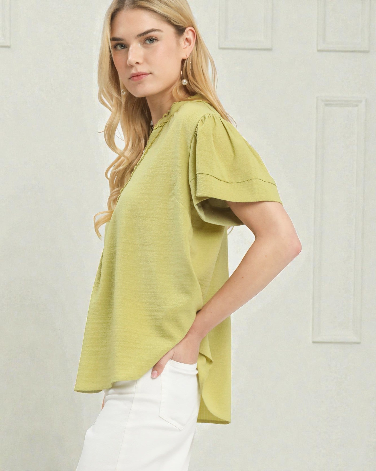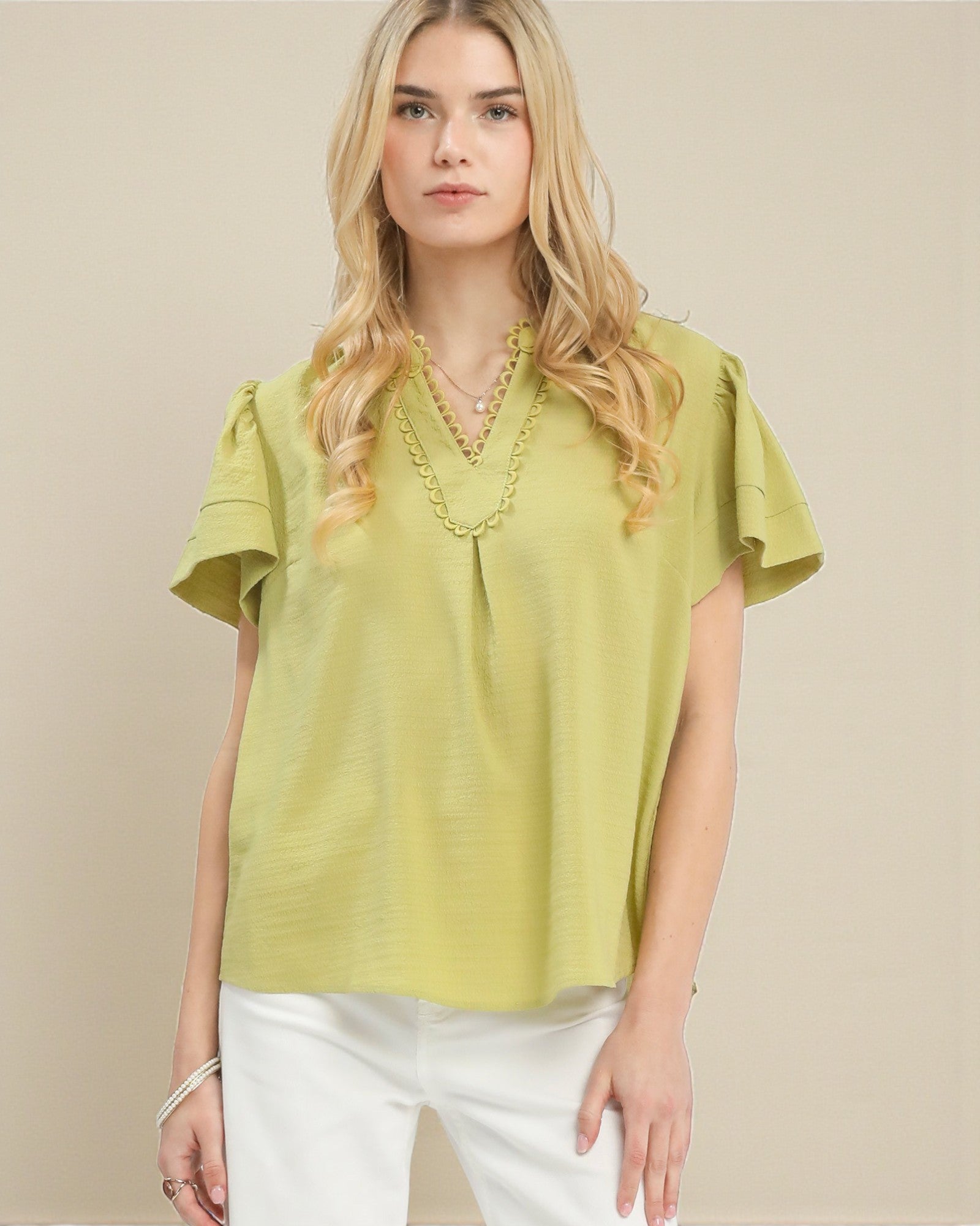 Brighten your wardrobe with this cheerful citron blouse, crafted from a soft rayon blend that drapes beautifully. Short sleeves keep things breezy and comfortable, while delicate scallop trim along the neckline adds a touch of whimsy and charm.