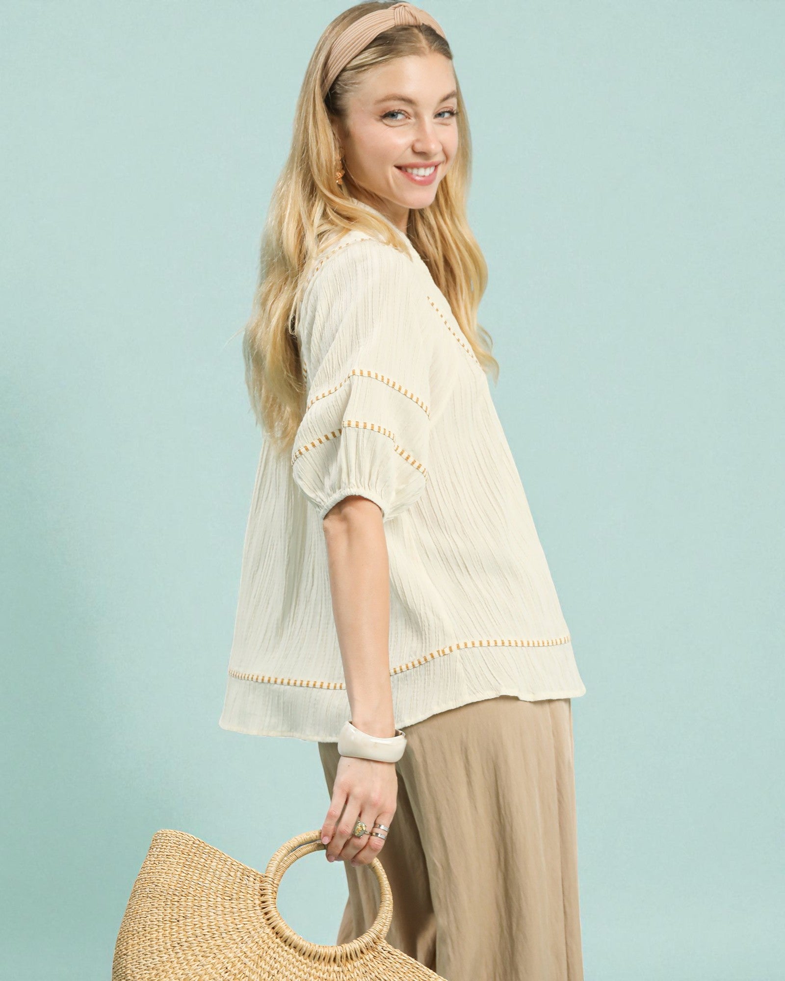 Effortlessly chic and oh-so-comfortable, this cream blouse pairs a silky rayon blend with delicate embroidered trim for a touch of understated elegance. Short sleeves keep things breezy and versatile, making it perfect for layering or wearing solo.