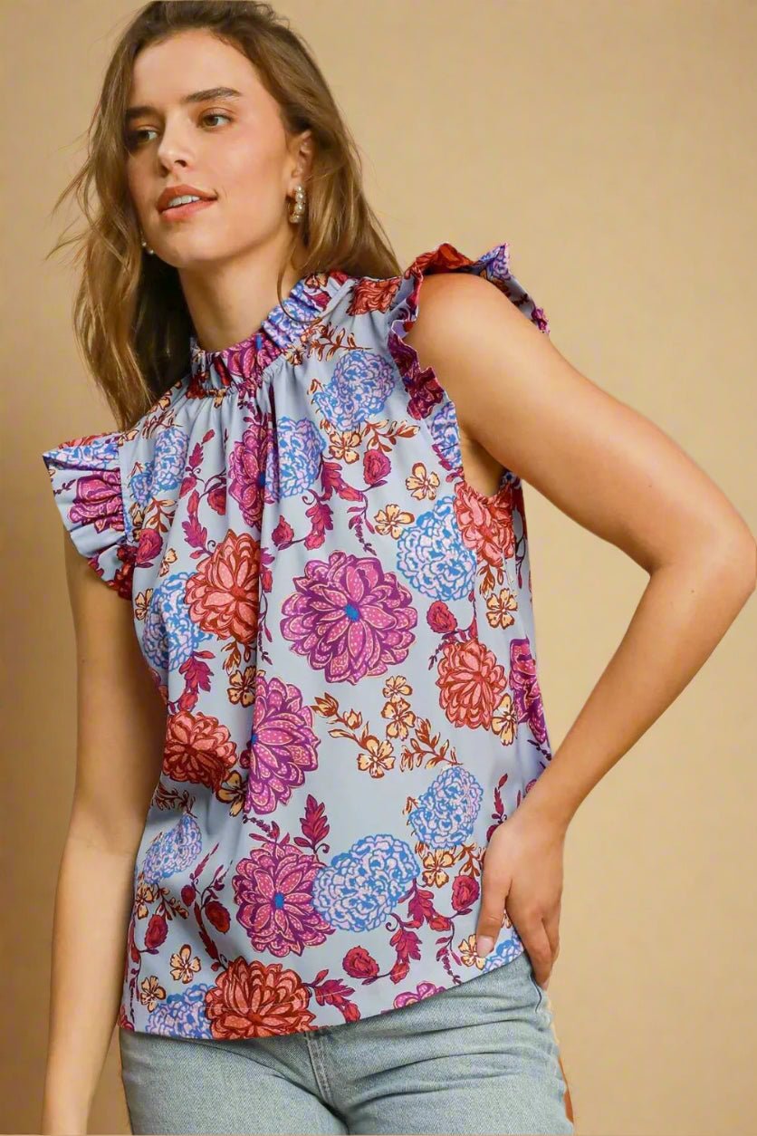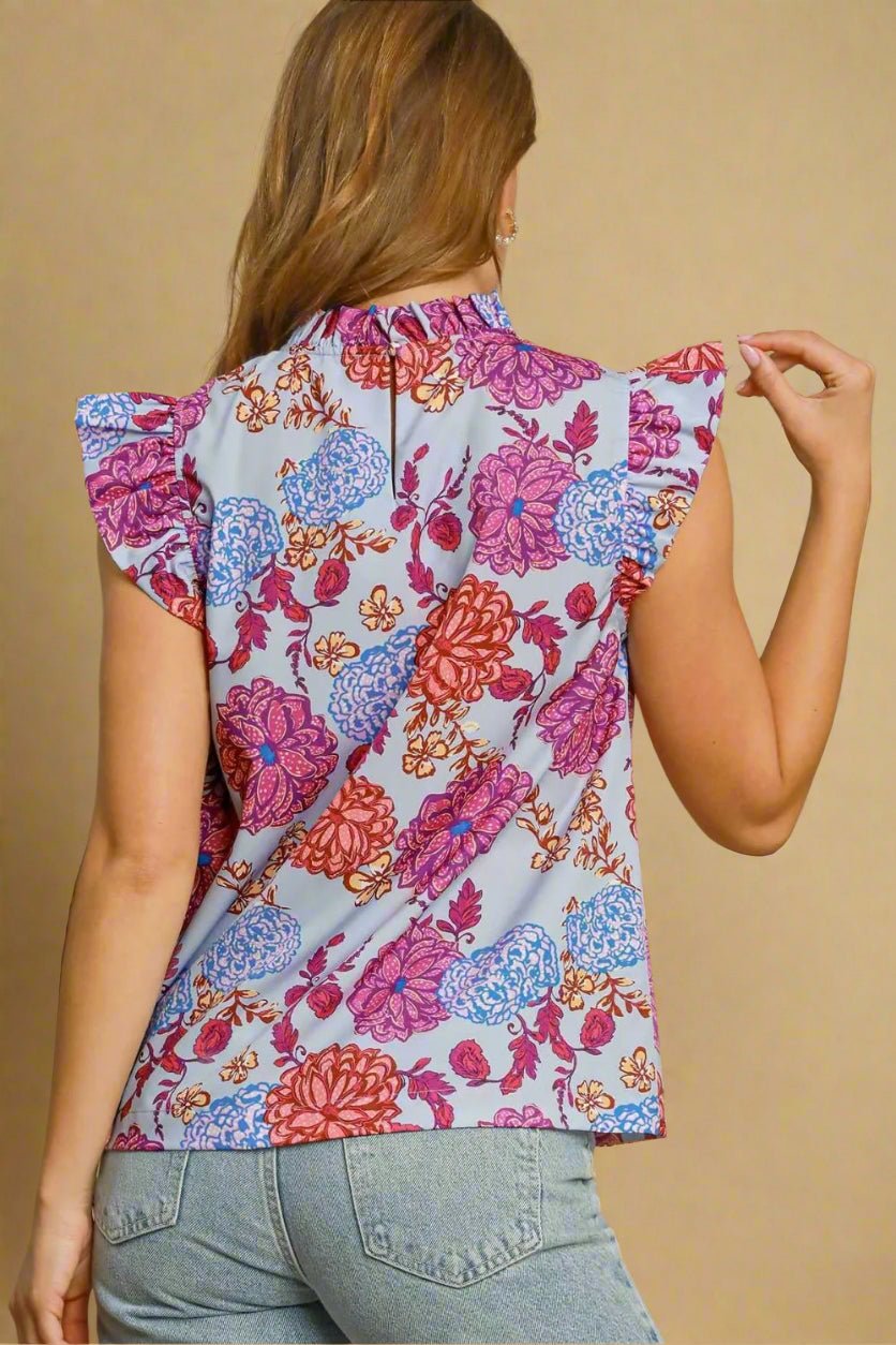 Introducing our Lavender Floral Ruffle Sleeve Blouse! With a shirred neckline and cap sleeves, this blouse is perfect for any occasion. Plus sizes are available, so everyone can enjoy the feminine details and comfortable fit. Bloom with confidence in this charming top.