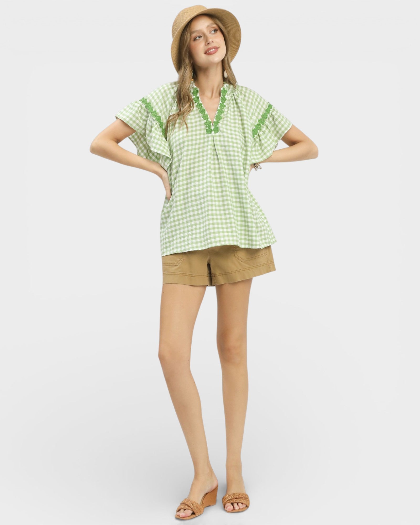 Sunshine in blouse form. This lime-and-ivory gingham top features flutter sleeves and pretty lace trim along the split V-neck and sleeves for a sweet, elevated finish. Lightweight with an easy, relaxed drape—perfect with denim, white shorts, or a breezy skirt.
