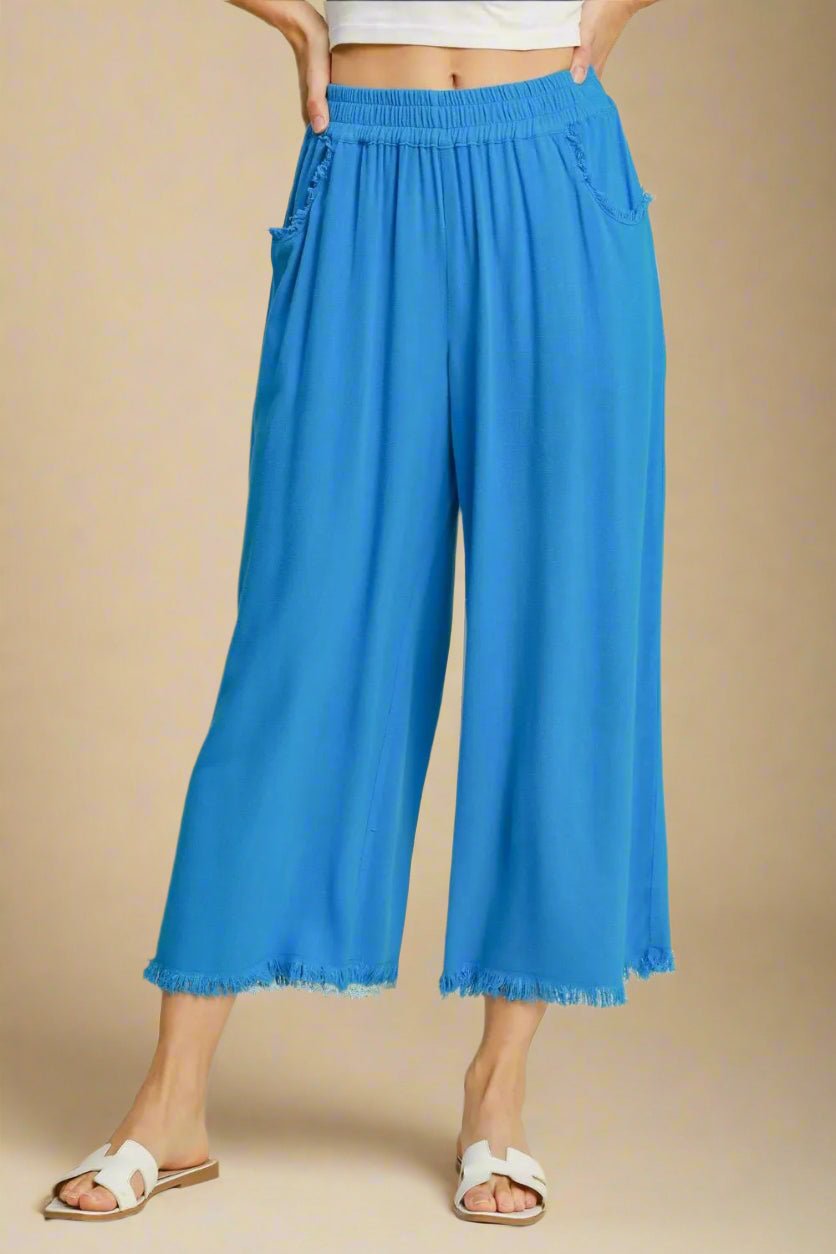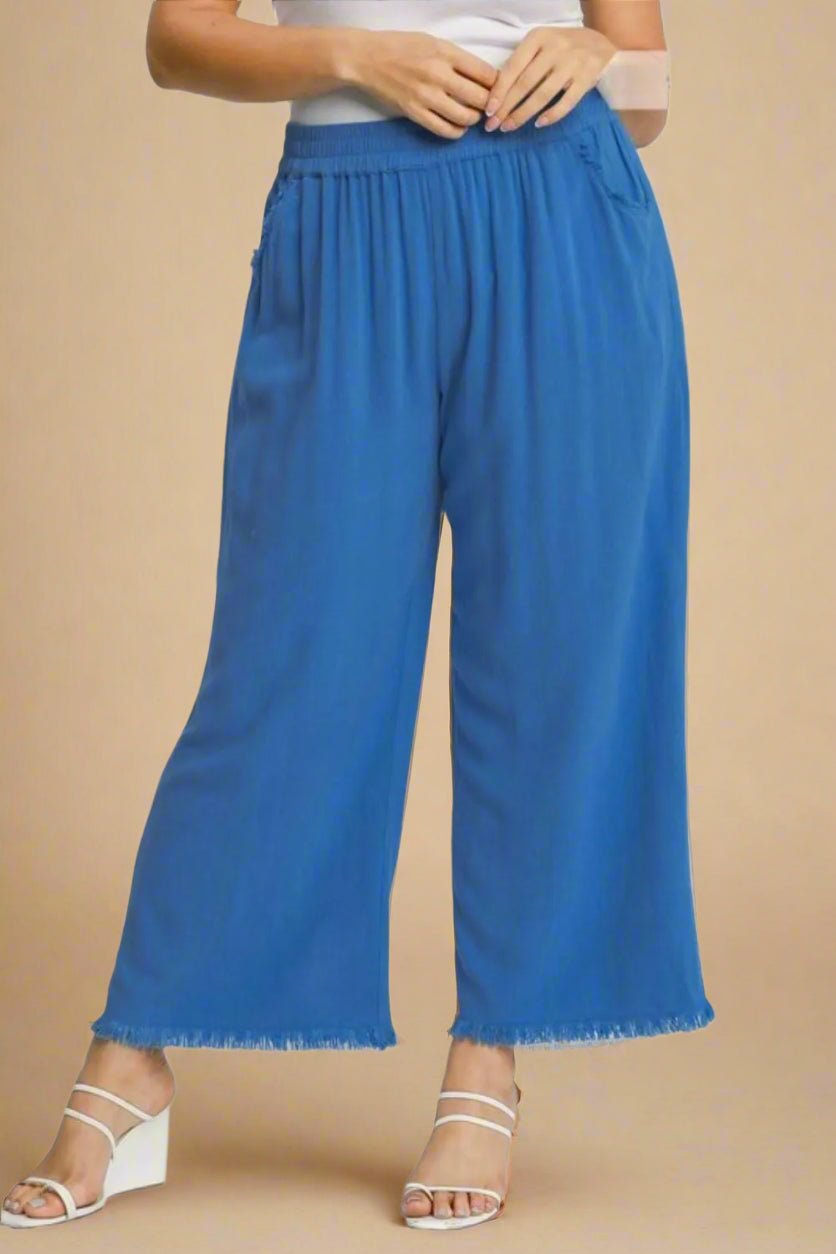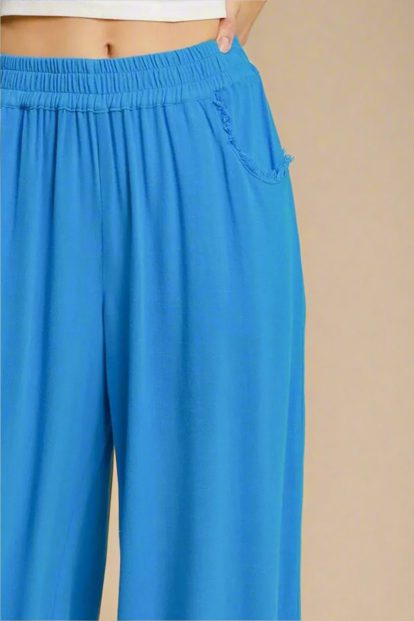 Dive into style with our Ocean Blue Frayed Hem Wide Leg Pants. Made from a comfy linen/cotton blend and available in plus sizes, these pants are perfect for any ocean-inspired look. Whether you're lounging on the beach or strolling the boardwalk, these pants will keep you cool and stylish.
