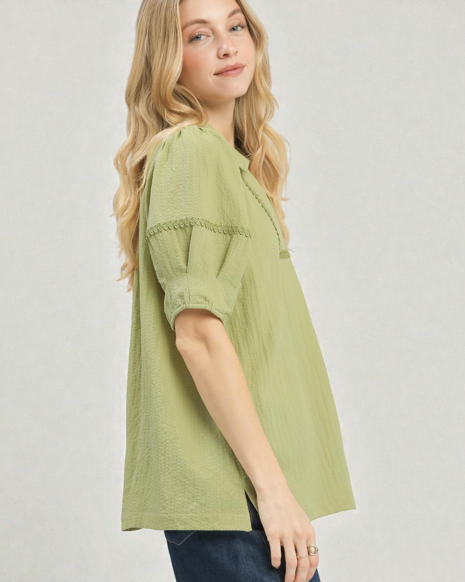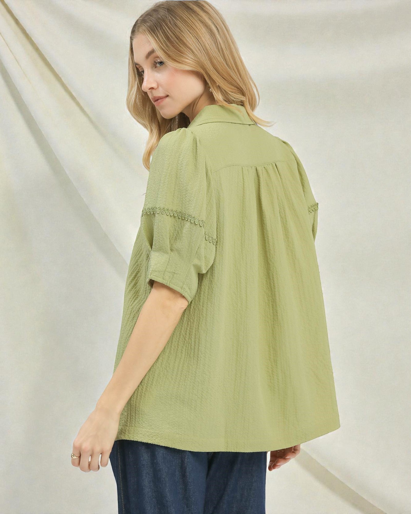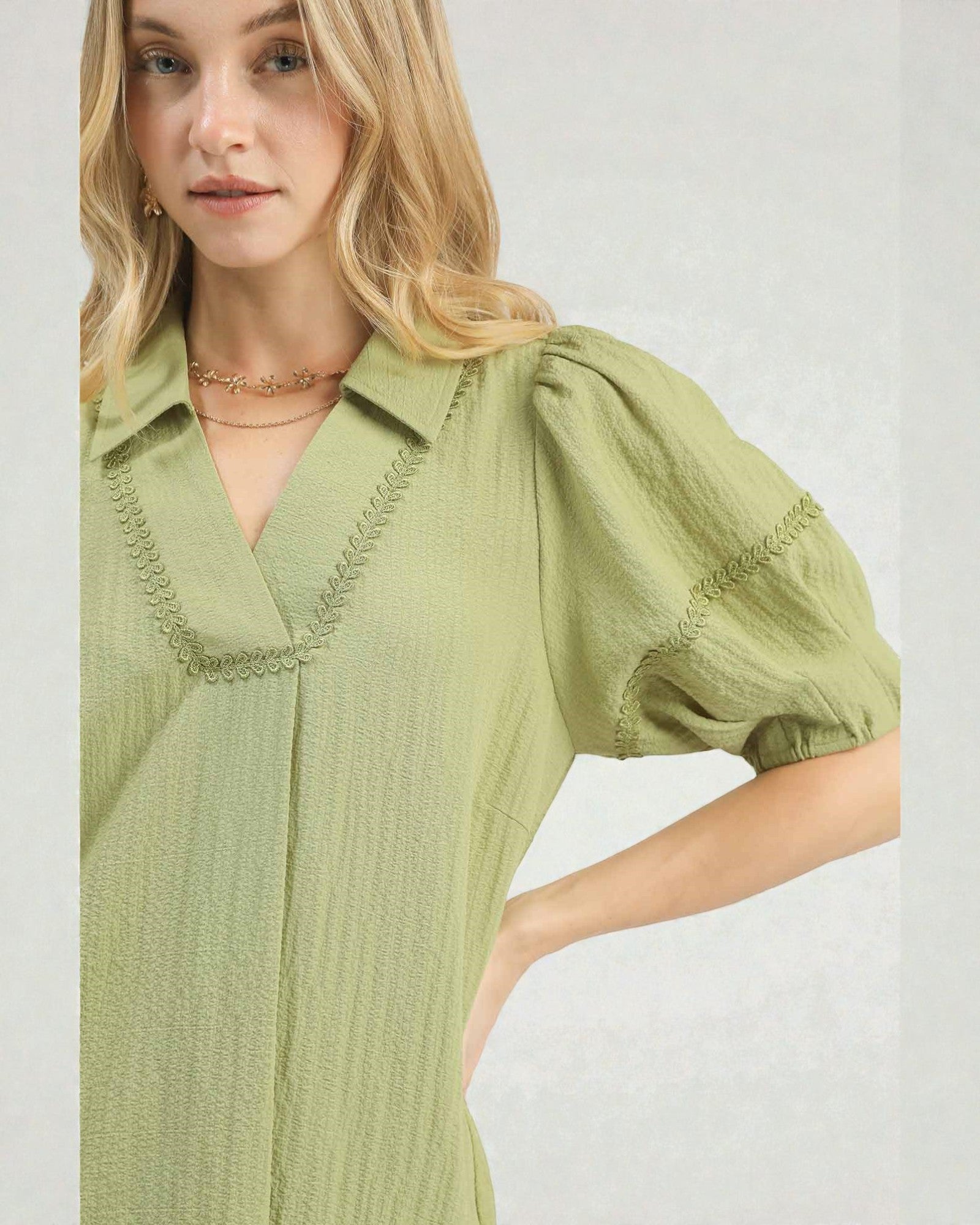 Effortless elegance meets laid-back charm in this olive V-neck blouse. Delicate embroidery details add personality to the classic silhouette, while short sleeves keep things breezy and comfortable. Perfect for casual outings or dressing up with your favorite accessories. A versatile wardrobe essential that works as hard as you do.