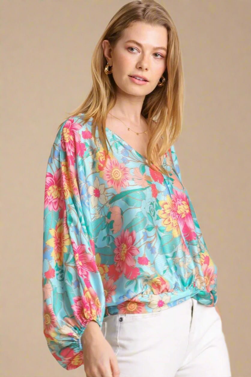 Tropical Floral V-Neck Blouse in Aqua Pink & Yellow