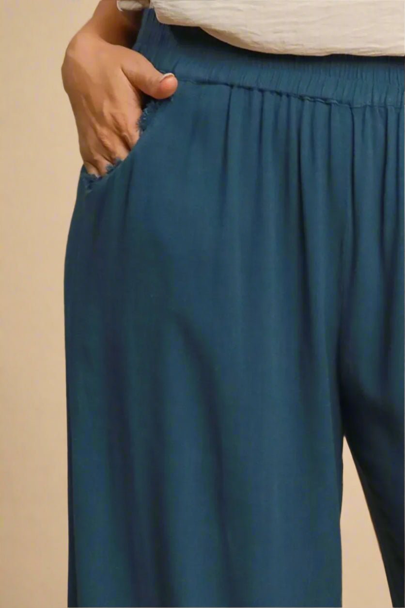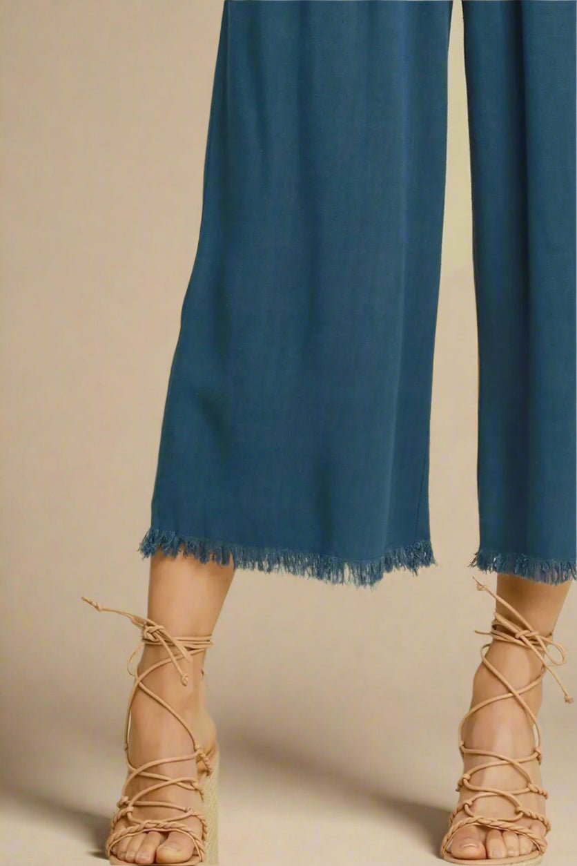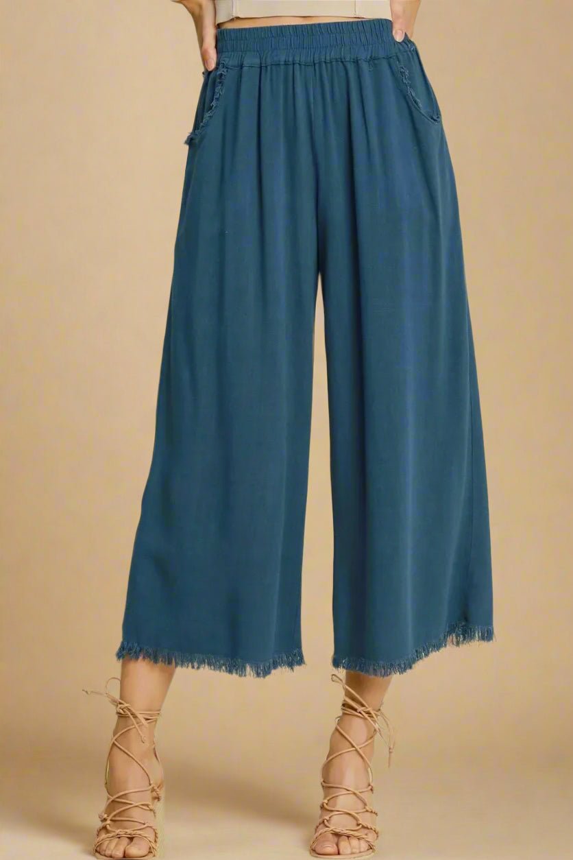 Dive into comfort with our Washed Indigo Wide Leg Frayed Hem Pants! These breezy bottoms feature a linen/cotton blend that's as soft as a beach day is long. The playful frayed hem adds a touch of carefree style, while the elastic waist means no pinching—just pure relaxation. Strut your stuff in these wide-leg wonders, available in plus sizes because fabulous comes in every size!