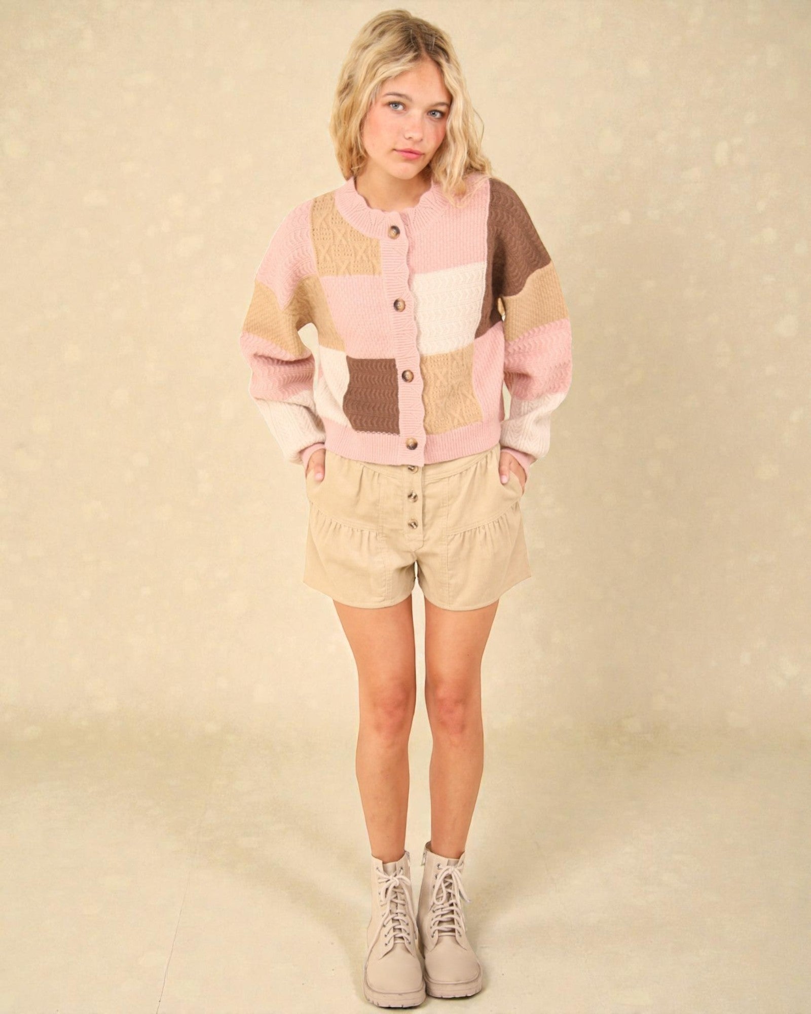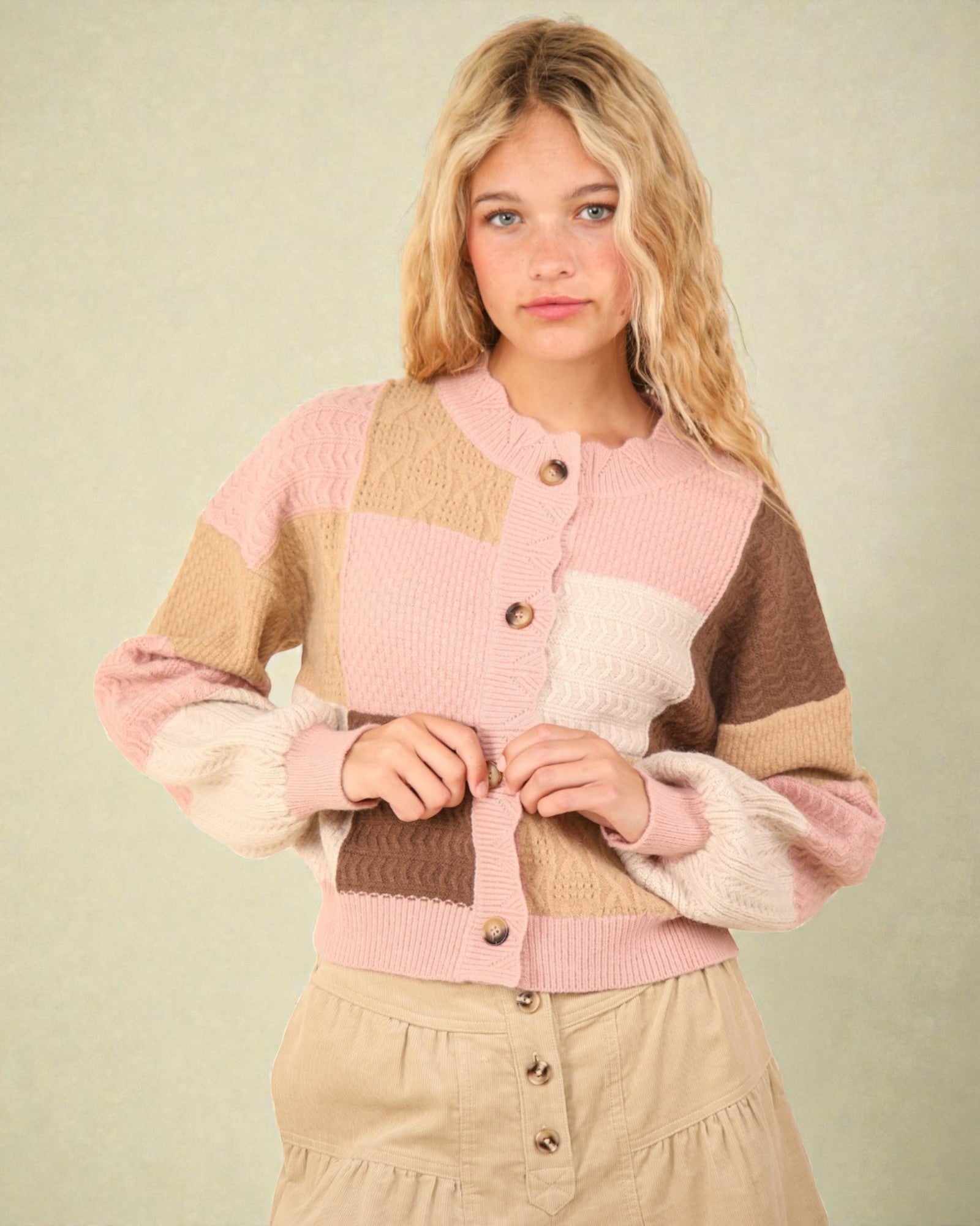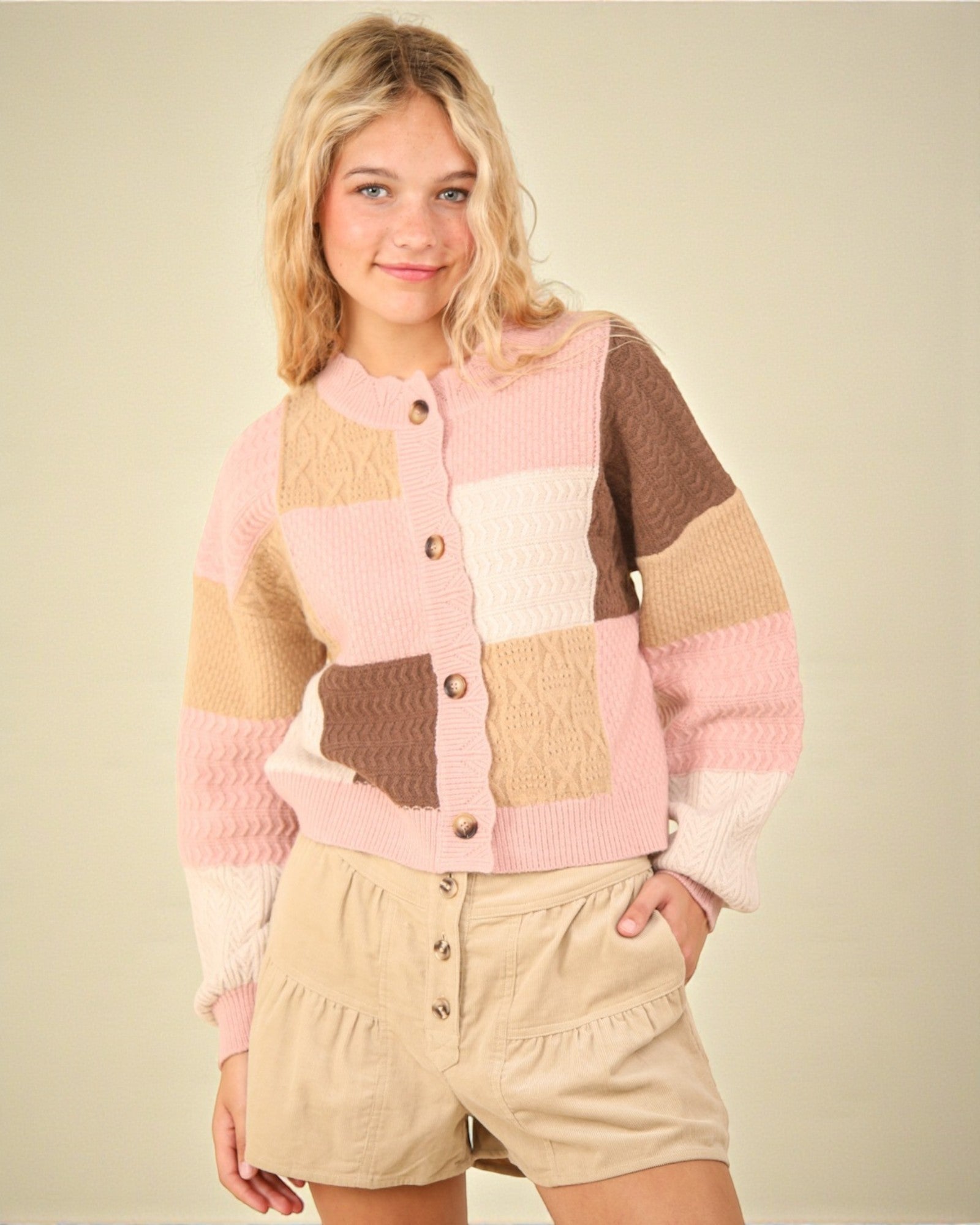 Faites vibrer votre garde-robe d'hiver avec notre cardigan texturé à boutons color block en blush. Fabriqué à partir d'un mélange de coton confortable, ce cardigan présente des manches longues pour vous garder au chaud tout en ajoutant une touche de couleur et de style à votre tenue. Parfait pour toutes les occasions, restez élégante et confortable dans notre cardigan unique et ludique.