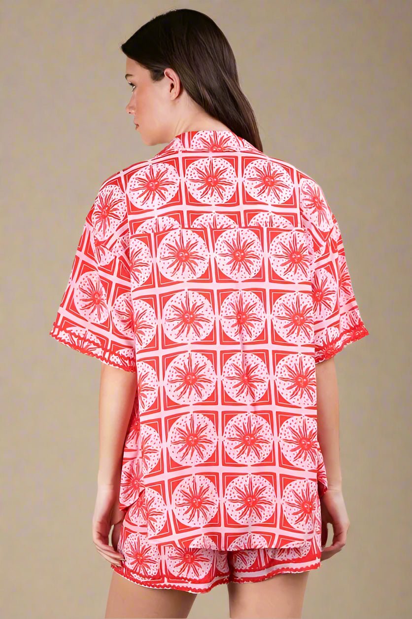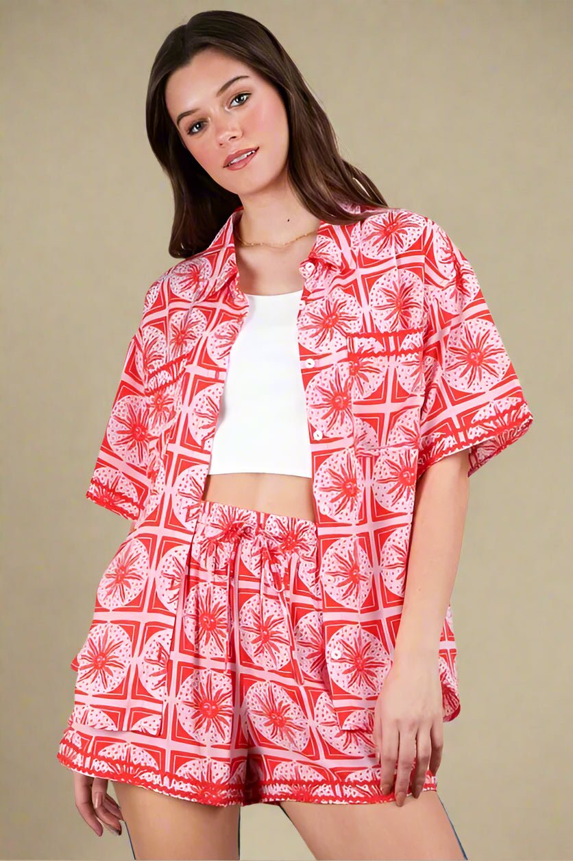 Enjoy sunny days in the playful Strawberry Mosaic Button Down & Shorts Set, featuring breezy short sleeves and a vibrant pattern. Designed with comfort in mind, this set is available in plus sizes to flatter every figure. Perfect for lounging or casual outings, it brings a fresh, fun vibe to your warm-weather wardrobe.