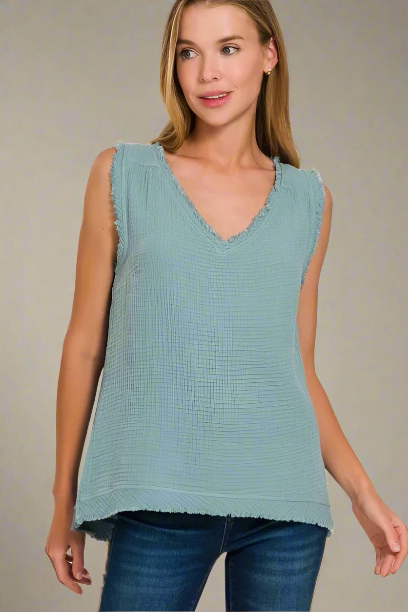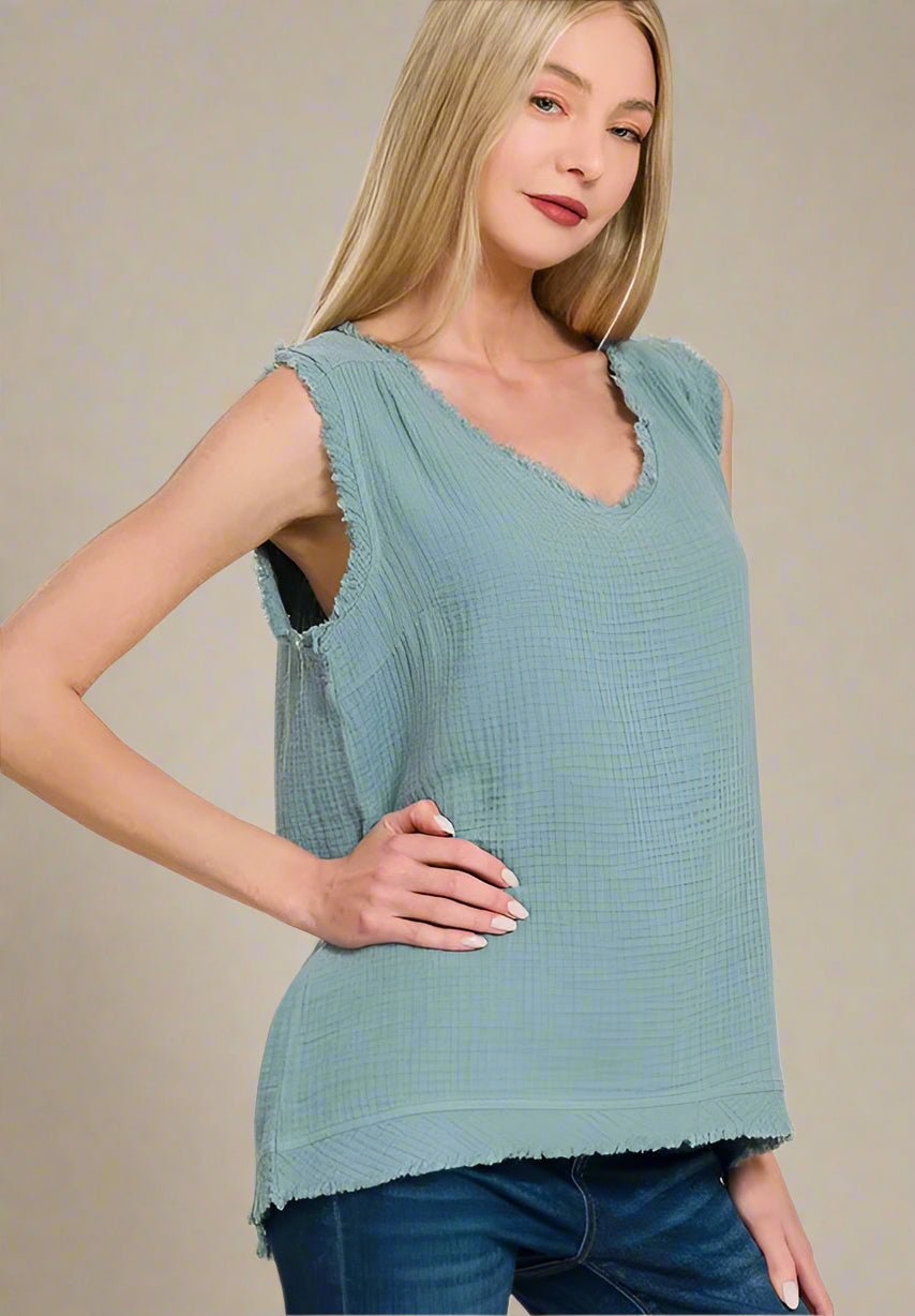 Stay cool and stylish in our Frayed V-Neck Sleeveless Top in Dusty Aqua Sage. Made from soft cotton, this breezy top features a relaxed fit and charming frayed edges that add a fun, carefree vibe to your look. Perfect for sunny days or layering up, it’s your new go-to for effortless comfort with a splash of playful charm.