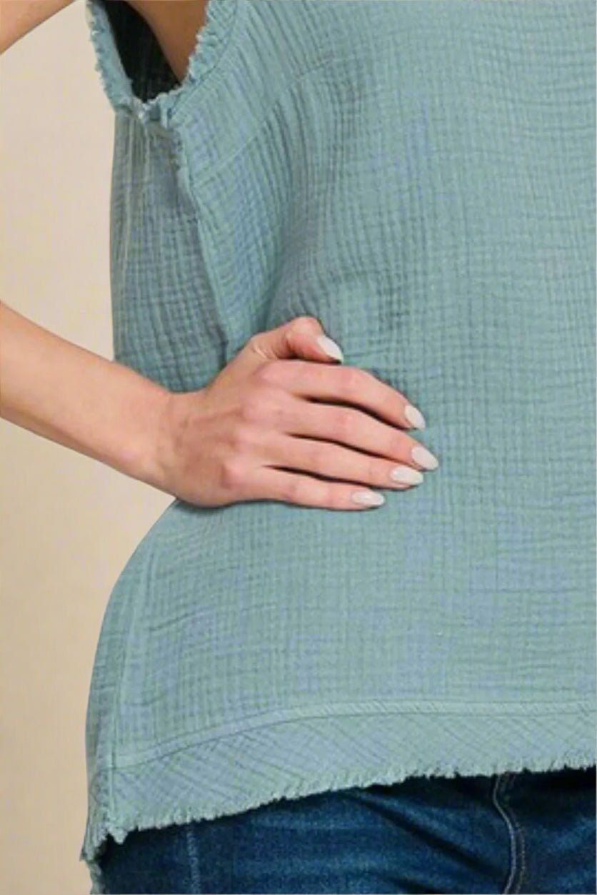 Frayed V-Neck Sleeveless Top – Dusty Aqua Sage