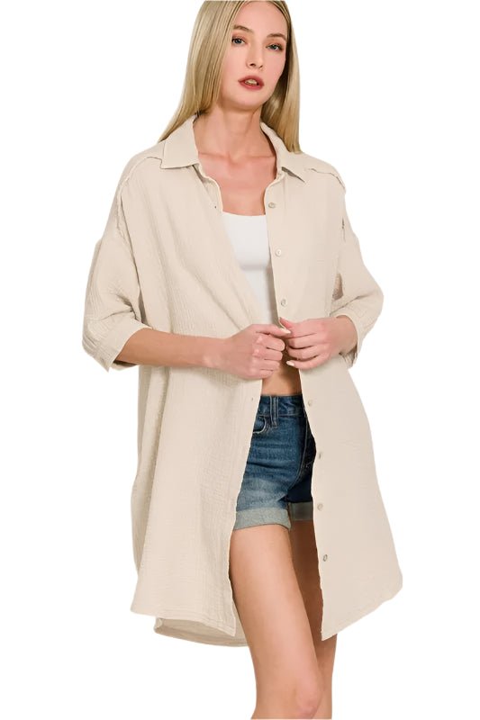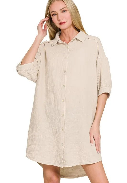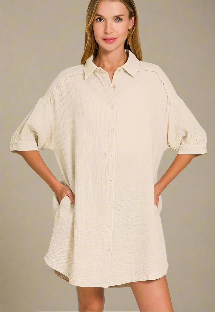 This cream-colored mini shirt dress is crafted from soft cotton gauze, perfect for breezy days. Featuring half sleeves and handy pockets, it combines comfort with a touch of casual charm. Button down the front for easy wear and playful style wherever you go!