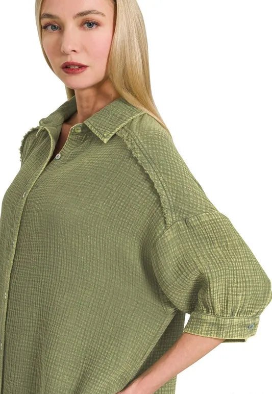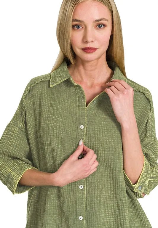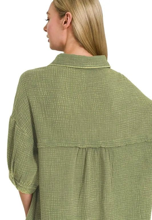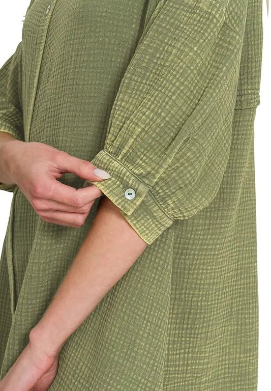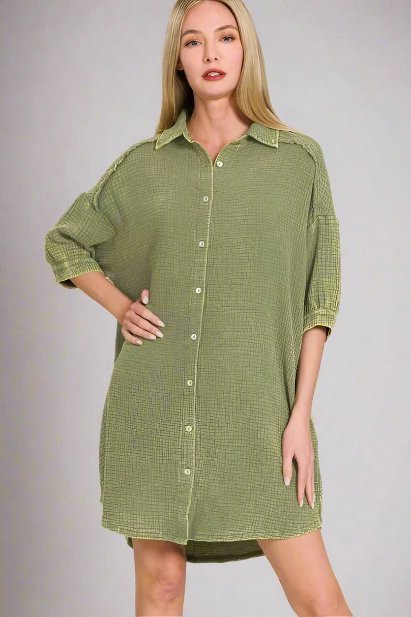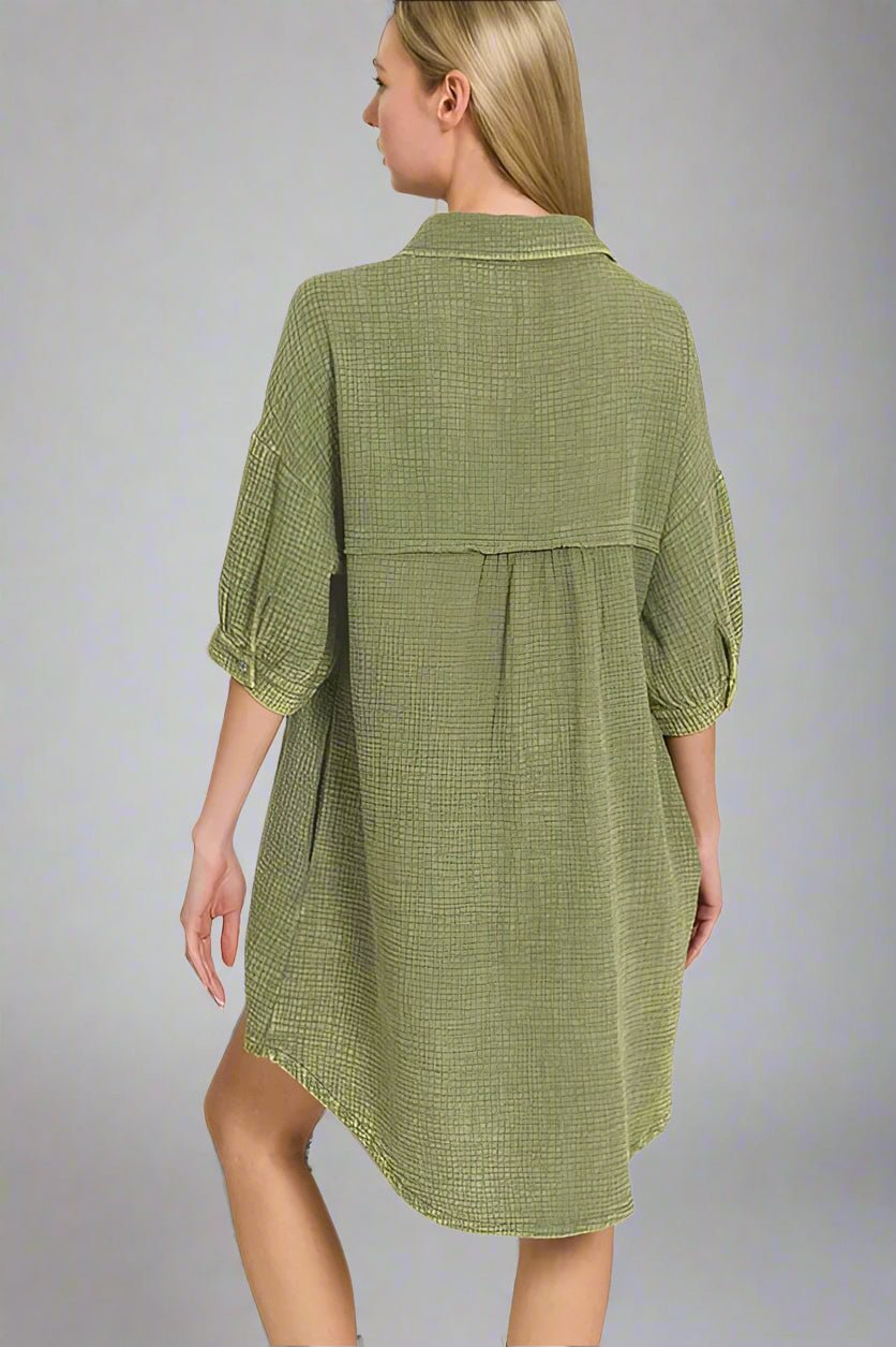 This playful olive mini shirt dress is crafted from soft cotton gauze, perfect for breezy days. Featuring half sleeves and handy pockets, it combines comfort with casual charm. Button down the front for an easy, laid-back look that’s ready for any adventure.
