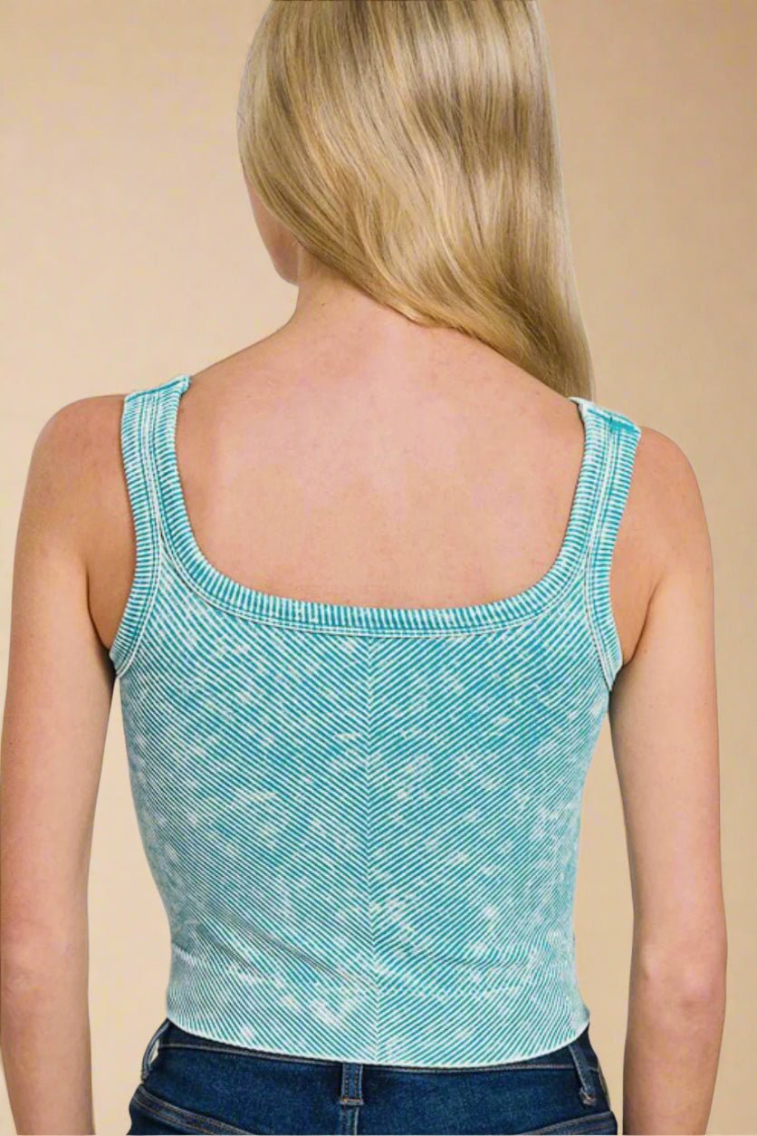 Get ready for a stylish summer with our Ice Blue Washed Rib Knit Crop Tank Top. Made with a nylon blend for a light stretch, this top is perfect for those hot days and nights. Stay comfortable and cool while looking effortlessly chic.