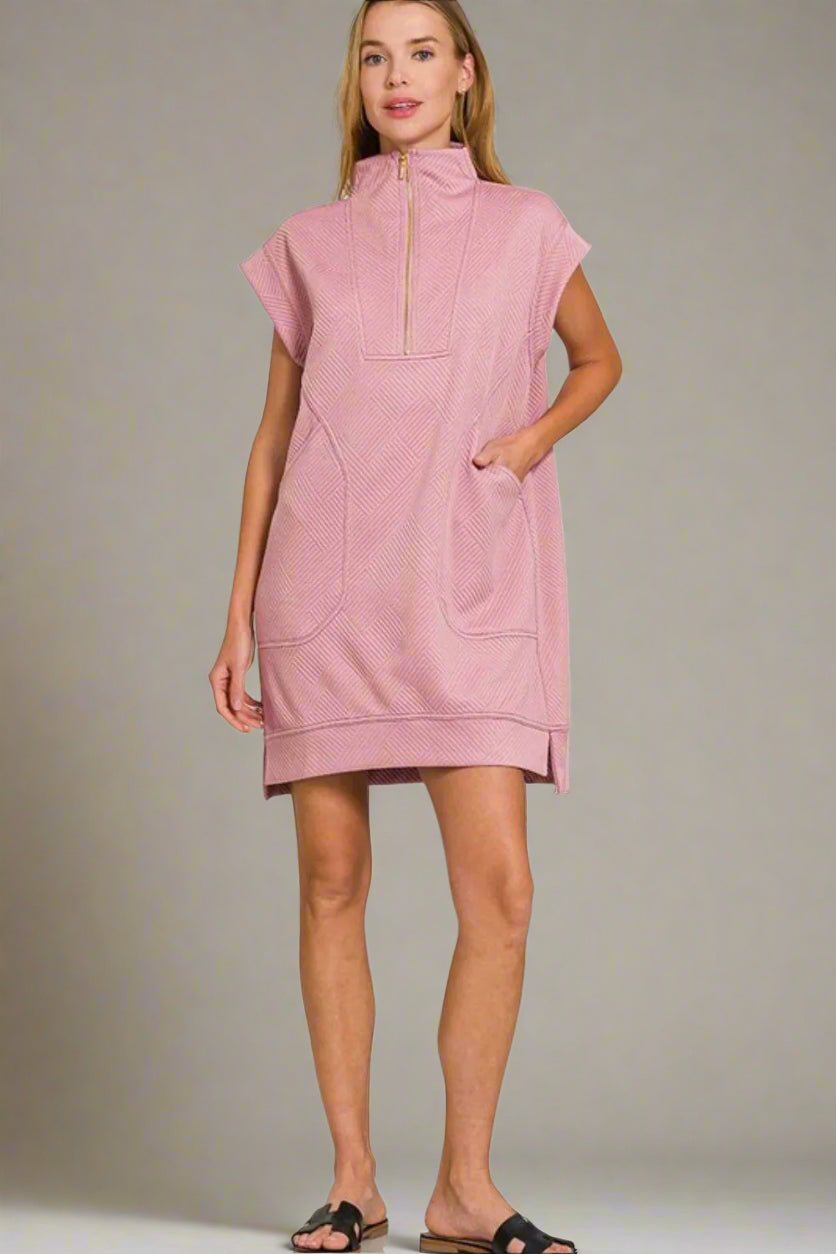 Textured Quarter-Zip Sport Mini Dress – Soft Rose