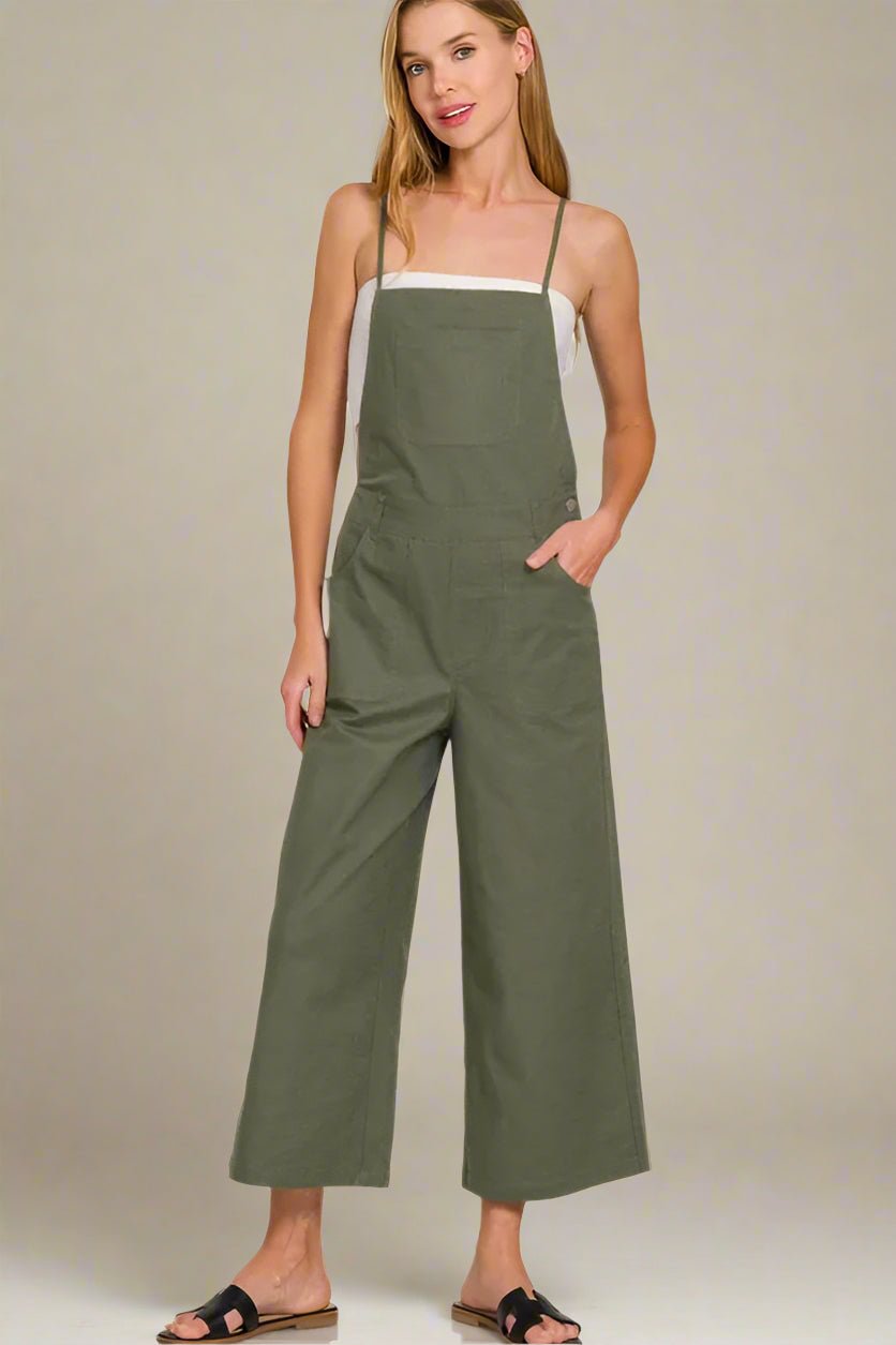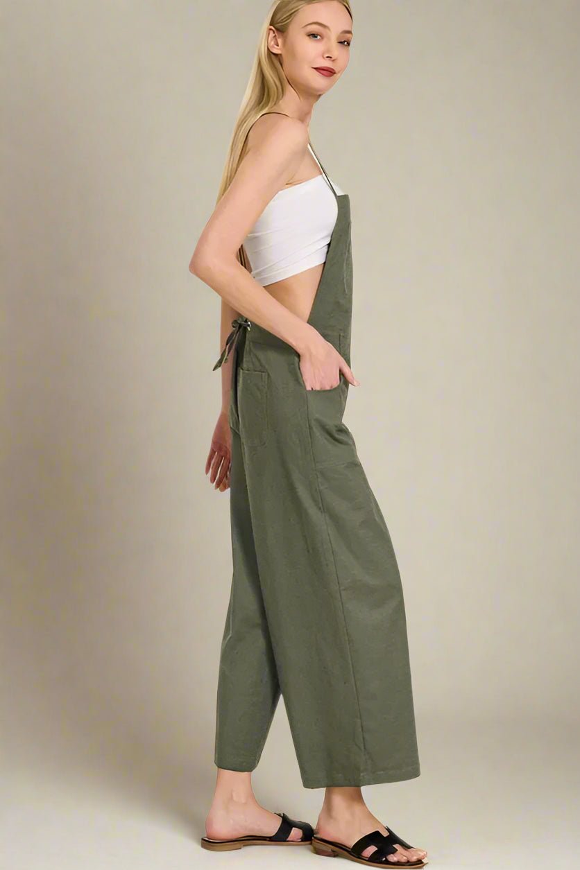 These Wide Leg Overalls in Olive Moss bring effortless style with a playful twist. Made from soft cotton, they feature comfy spaghetti straps and handy pockets for your essentials. Perfect for sunny days or casual outings, they combine comfort and fun in one easy outfit.