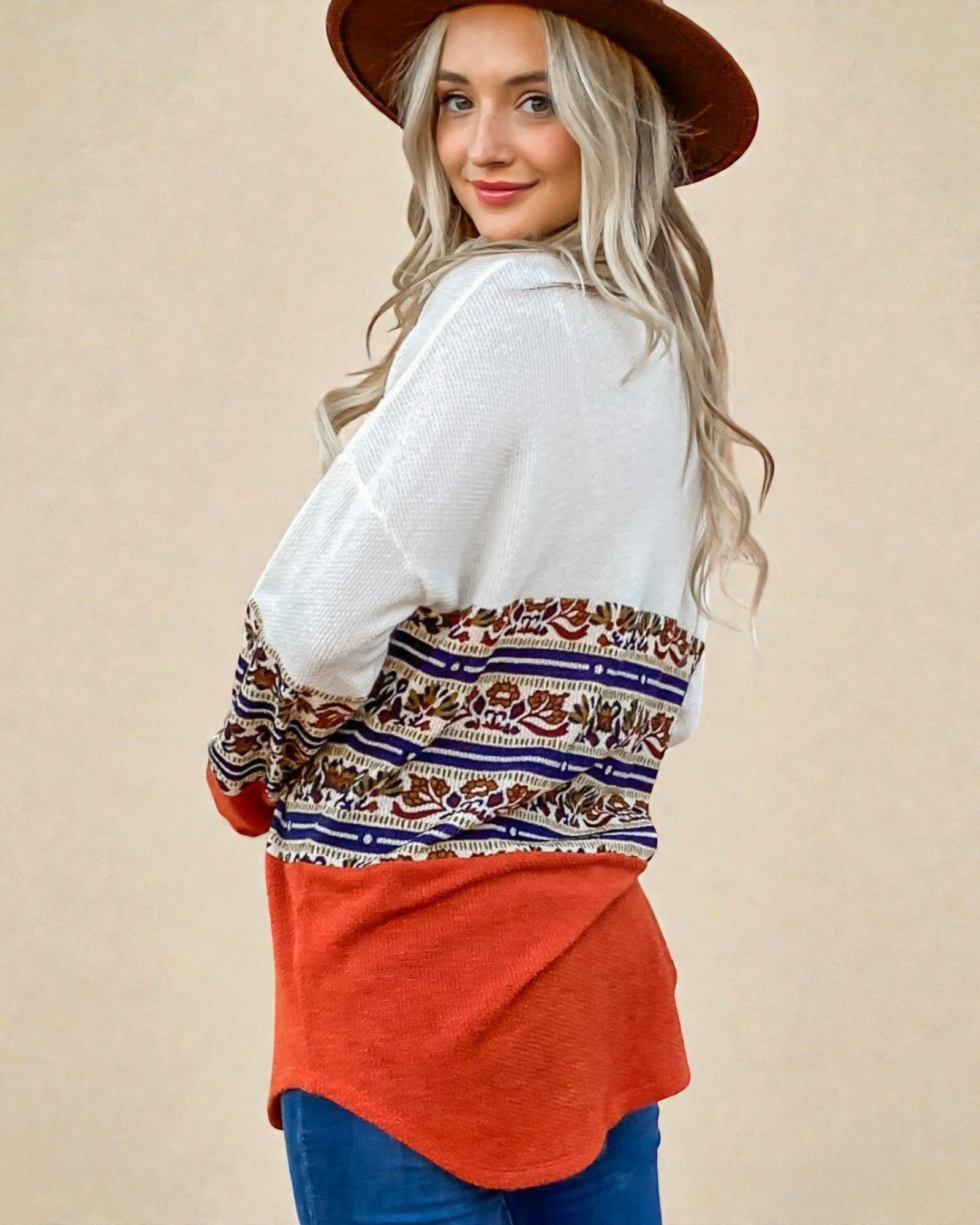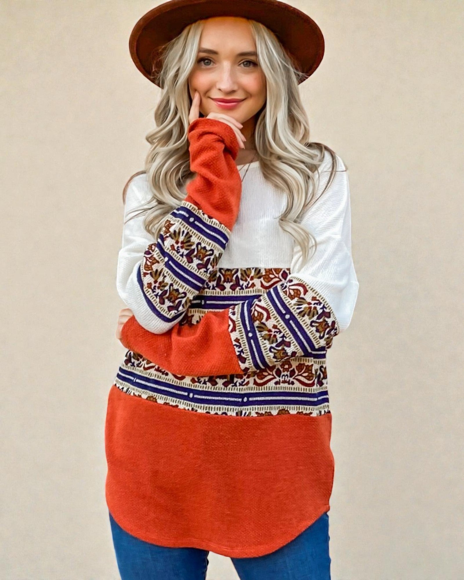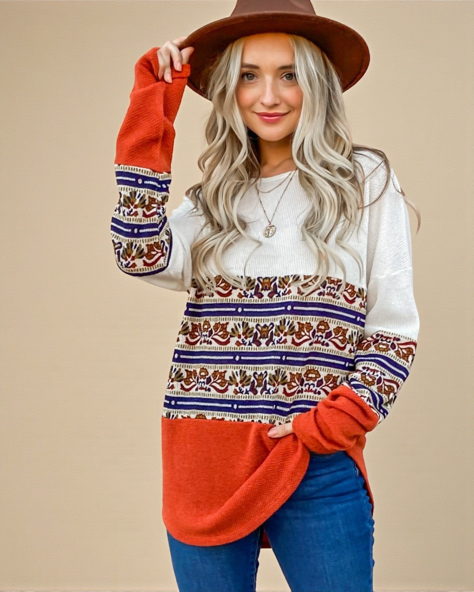 Effortless boho vibes meet everyday comfort in this striped pullover. Featuring warm ivory and rust tones in a relaxed pattern, it's designed with long sleeves and a mid-length cut that hits just right—perfect for layering or wearing solo. Slip it on for that laid-back, put-together look that works from coffee runs to casual hangouts. A wardrobe staple that feels as good as it looks.