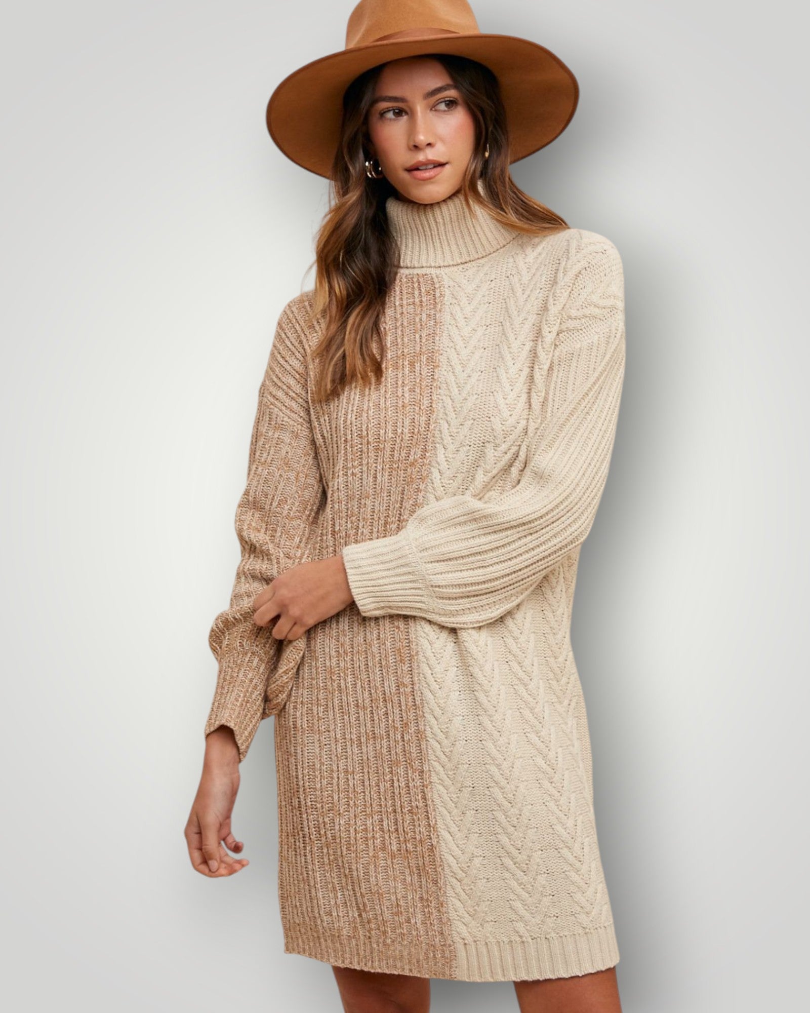 Cream & Tan Two-Tone Turtleneck Sweater Mini Dress
