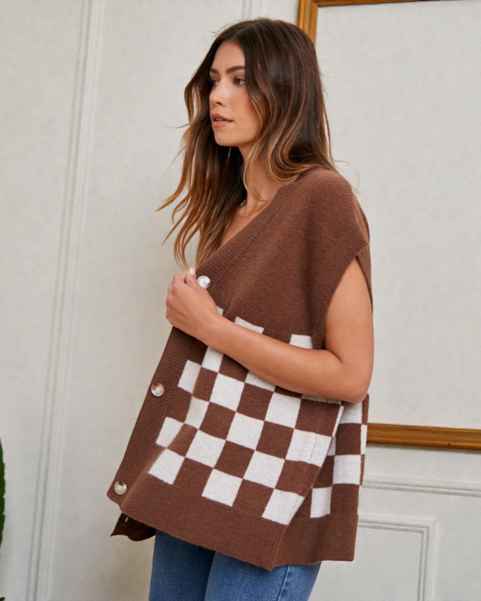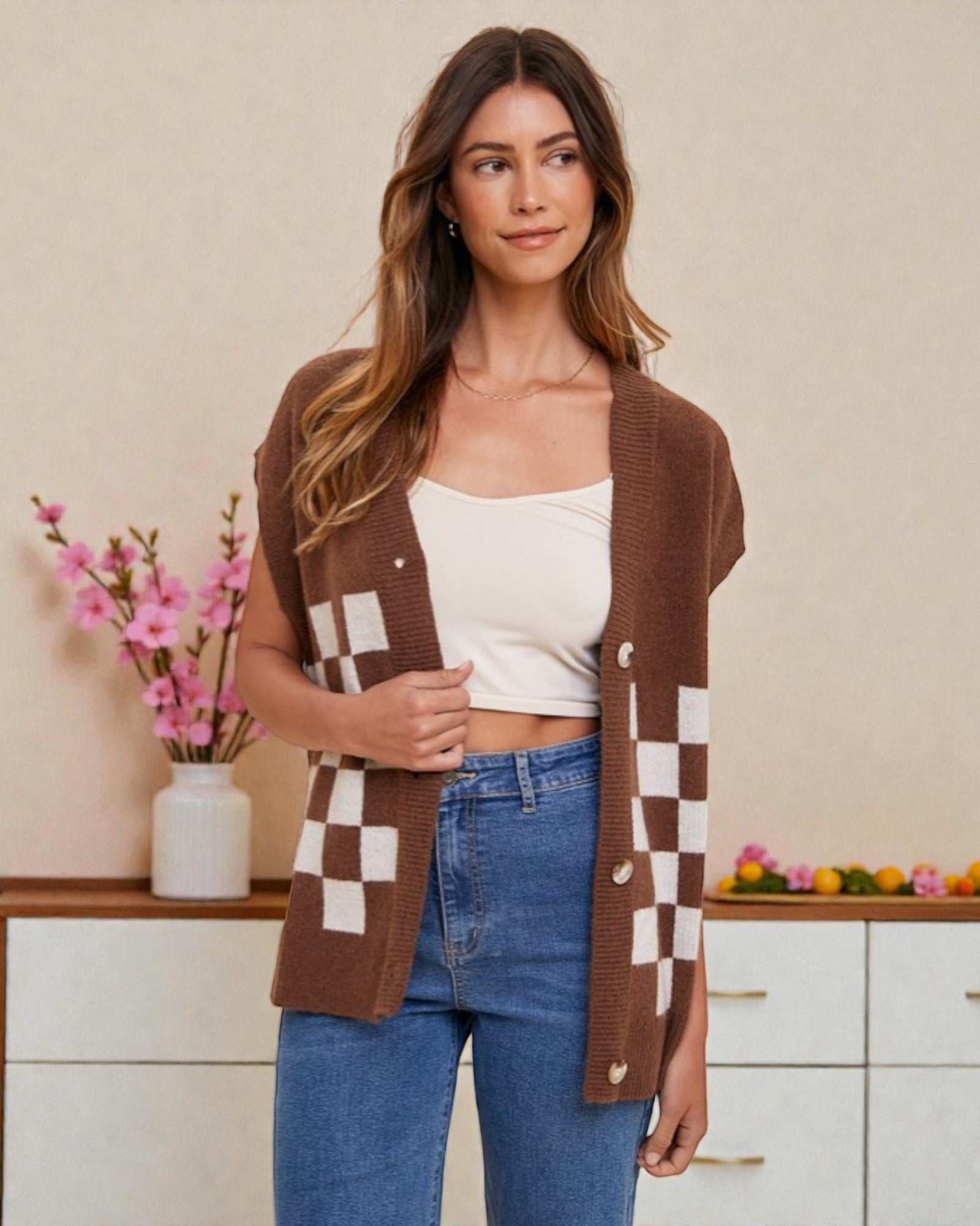 Upgrade your style game with our Dark Brown Checkered Short Sleeve Cardigan! Featuring a button front closure, this cardigan adds a touch of sophistication to any outfit. Stay trendy and comfortable all day long. Fashion forward and cozy - win-win!