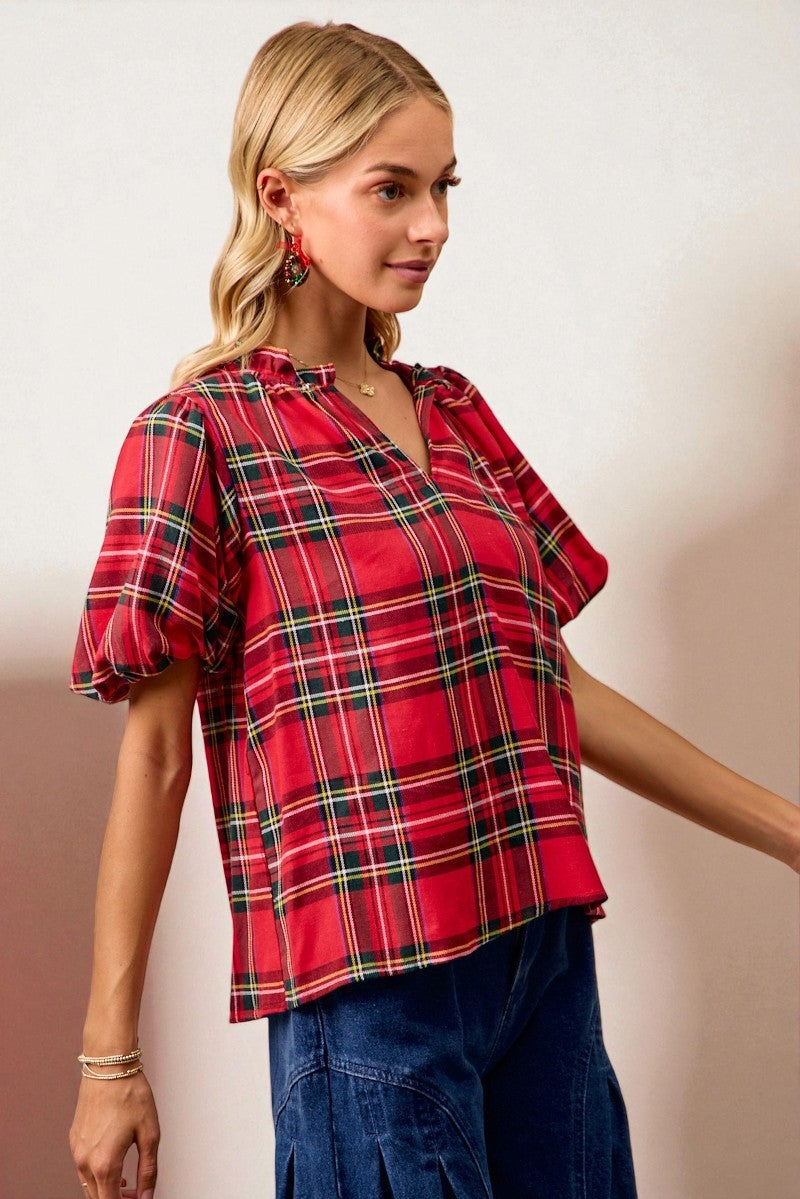 Bring a pop of pattern and personality to your wardrobe with this charming red plaid top! Crafted from a soft cotton blend, it's comfortable enough for all-day wear while the lined construction ensures a polished look. The short puff sleeves add a flirty, feminine touch that's perfect for dressing up casual outfits or pairing with your favorite skirts.