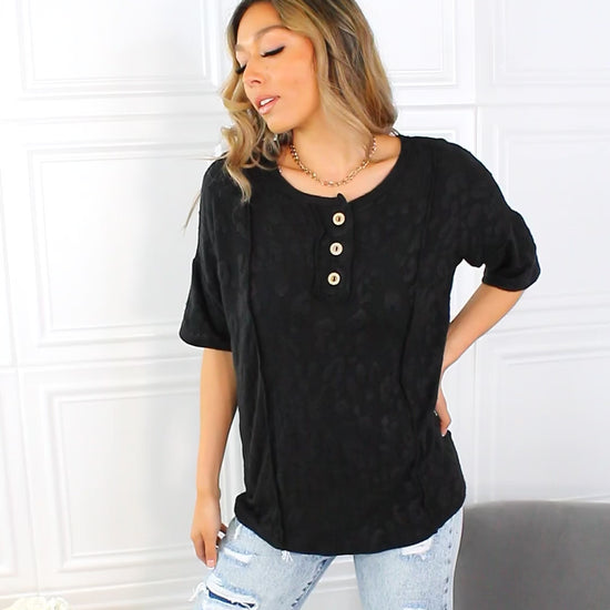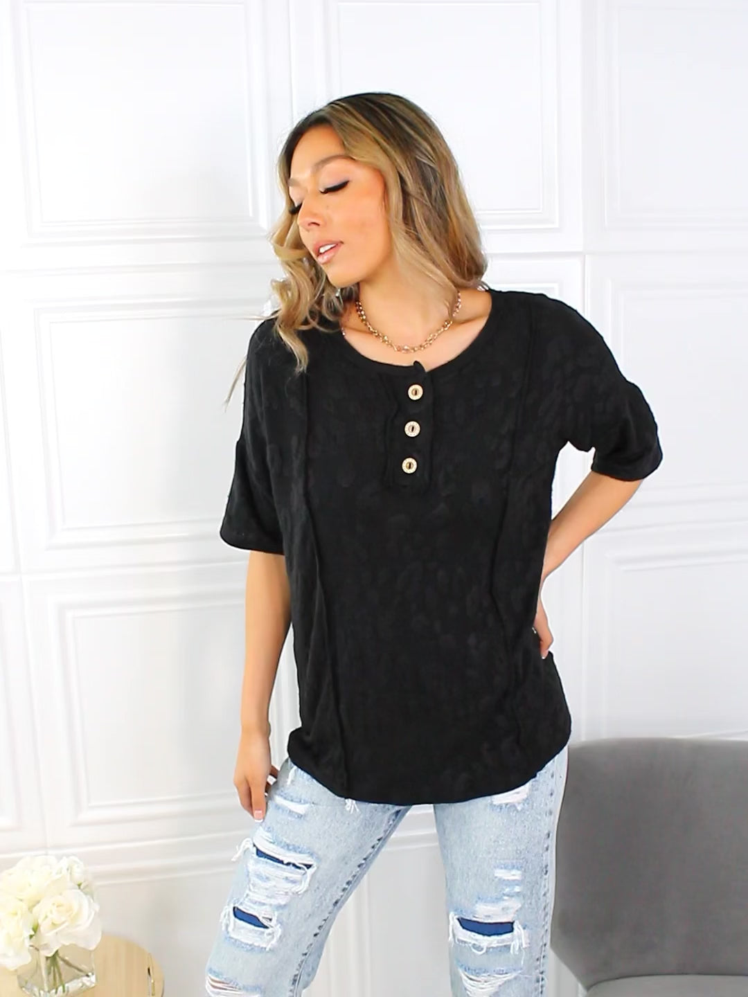 Black Jacquard Henley Tee with short sleeves—the perfect blend of texture and ease. The jacquard weave adds visual interest without fussiness, while the henley neckline brings just enough structure to feel intentional. Throw it on with anything and feel effortlessly put-together. Minimalist vibes, maximum comfort.