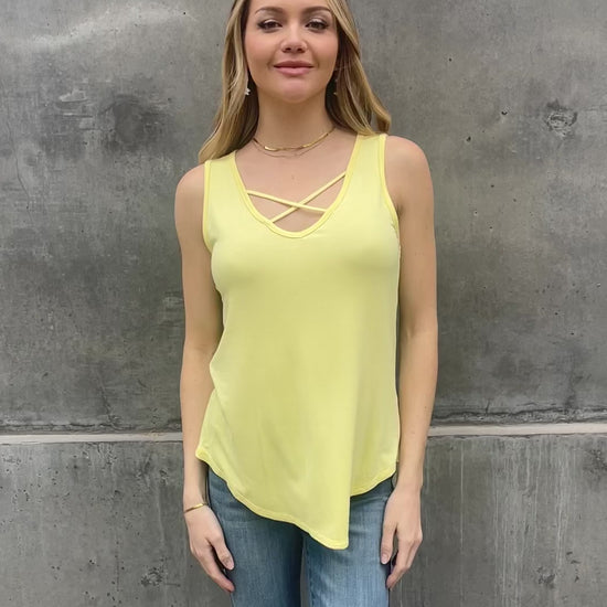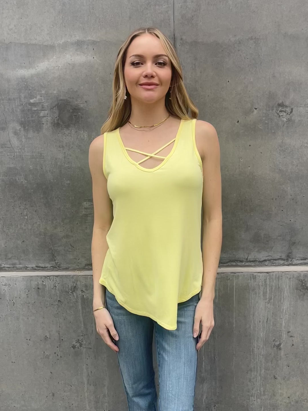 Slip into effortless summer style with this butter yellow tank that's as soft as it sounds. The crisscross neckline adds a flirty twist while the rayon blend fabric drapes beautifully and feels incredibly comfortable against your skin.